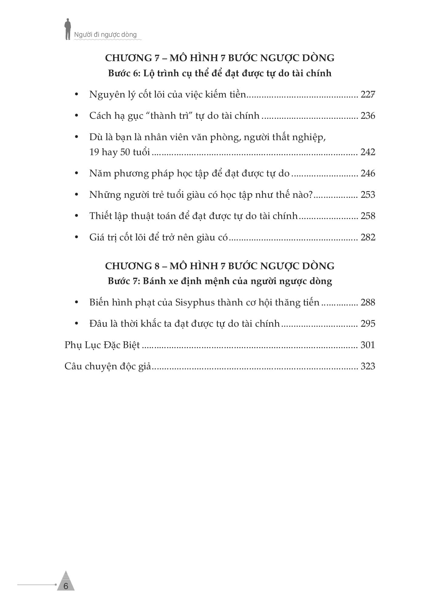 Cuốn sách được chia thành 8 chương chính, với trọng tâm là “Mô hình 7 bước ngược dòng” – một hệ thống tư duy dẫn dắt người đọc từng bước thoát khỏi rào cản tâm lý, di truyền và xã hội để kiến tạo tự do thực sự.