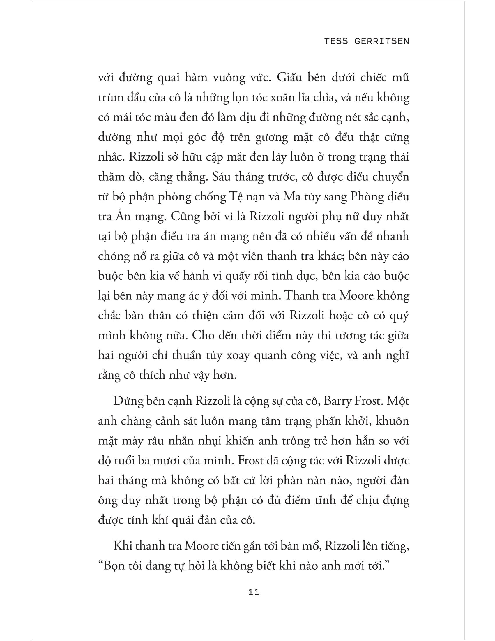 TESS GERRITSEN Là một bác sĩ chuyên nghiệp, Tess Gerritsen vốn mang trong m.ình tình yêu với những con chữ. Trong quá trình nghỉ thai sản, Tess đã viết truyện ngắn đầu tay của m.ình và giành giải nhất của một cuộc thi viết trên tạp chí Honolulu. Từ đó, bà quyết định theo đuổi đam mê viết lách.