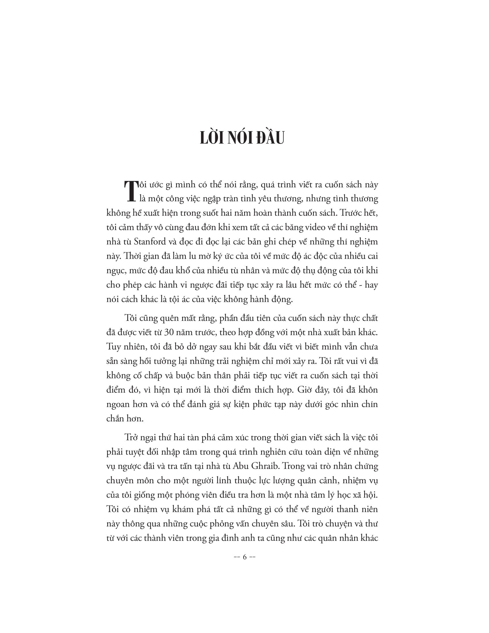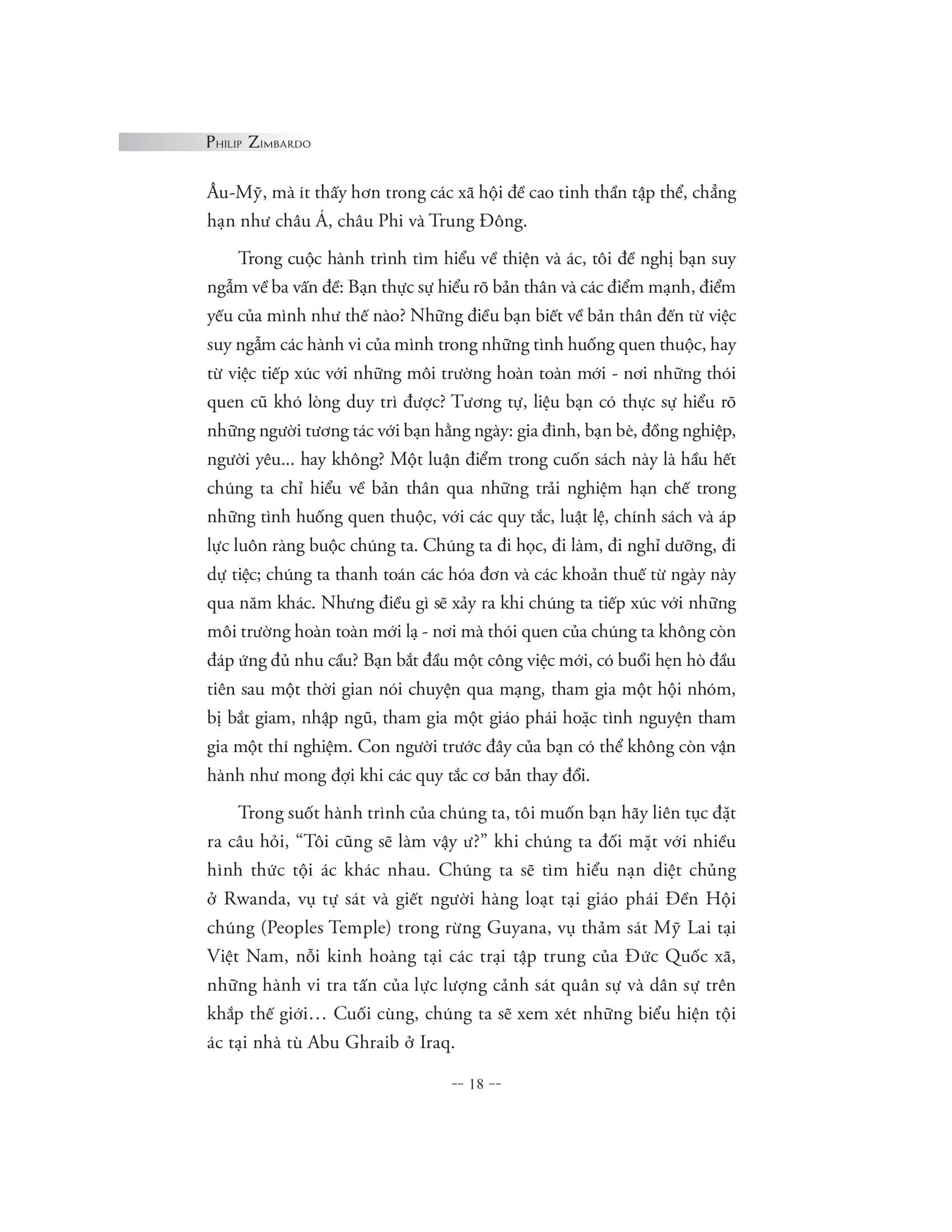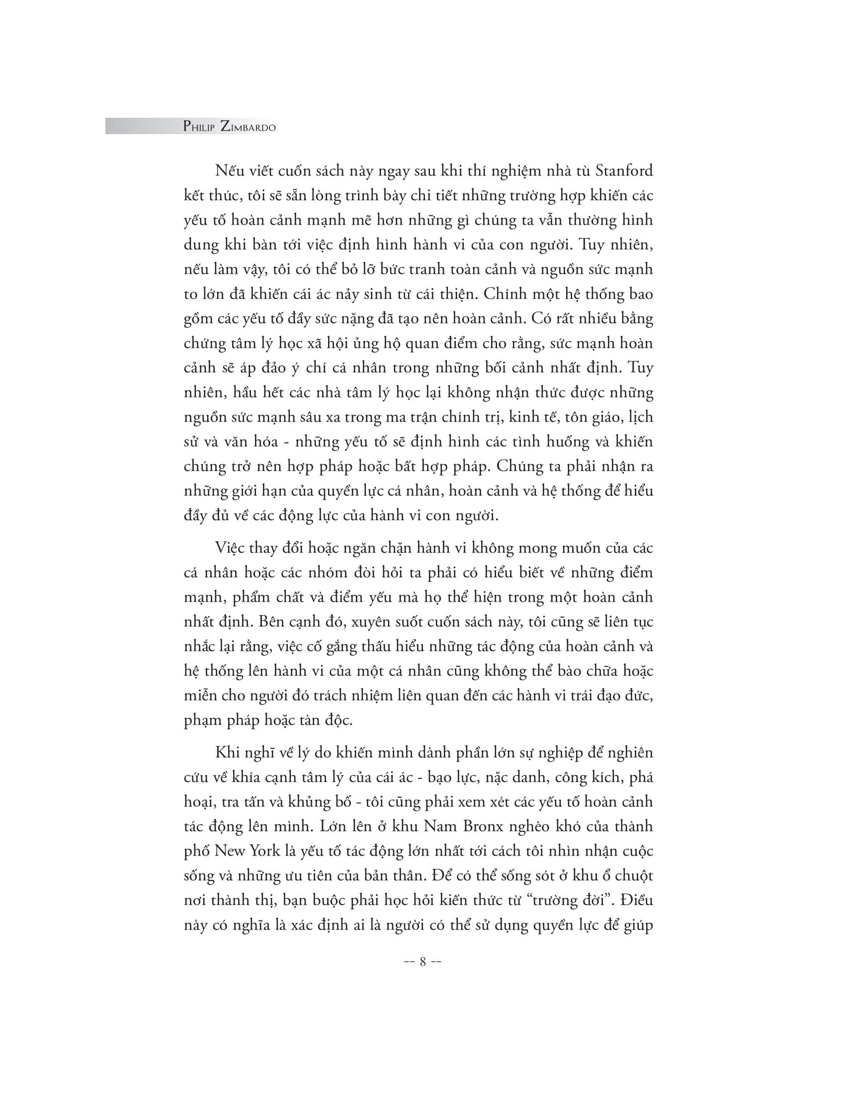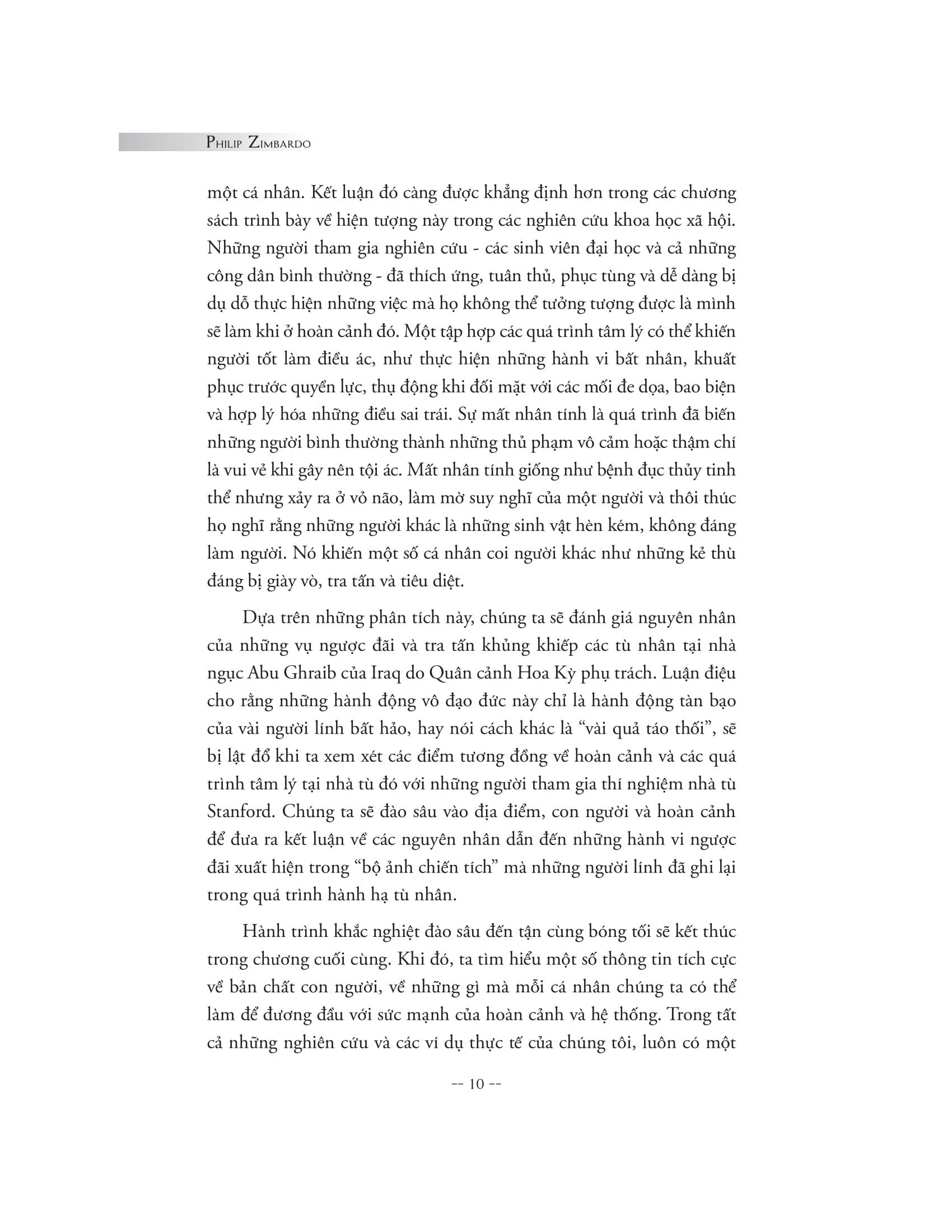 Cuốn sách là bản tường thuật chân thực và chi tiết nhất về thí nghiệm nhà tù Stanford kinh điển do Philip Zimbardo chủ trì thực hiện, bên cạnh việc phân tích nhiều nghiên cứu tâm lý xã hội gây sốc khác và nhìn lại những câu chuyện thực tế kinh hoàng mãi mãi in dấu trong lịch sử. Và khiến chúng ta phải có cái nhìn khác về bản chất của con người, rằng ranh giới thiện - ác không hề bất khả x.âm phạm và mỗi cá nhân đều có thể dễ dàng sa ngã và bị cuốn theo sự tàn độc. Nhưng bằng cách hiểu được những yếu tố tâm lý chi phối tâm trí và hành vi trong những bối cảnh cụ thể, con người hoàn toàn có khả năng rèn luyện để giữ m.ình trước những cám dỗ của cái ác và sự phi nghĩa, thậm chí có thể dũng cảm đứng lên đấu tranh, thực hiện những hành động anh hùng vì những giá trị nhân đạo vĩnh cửu.