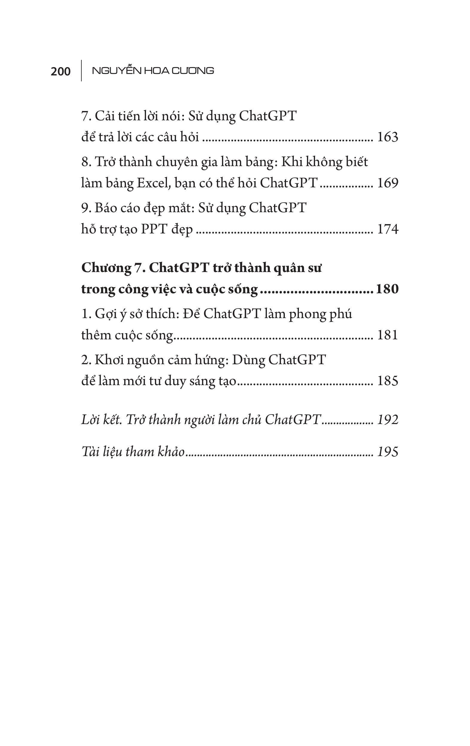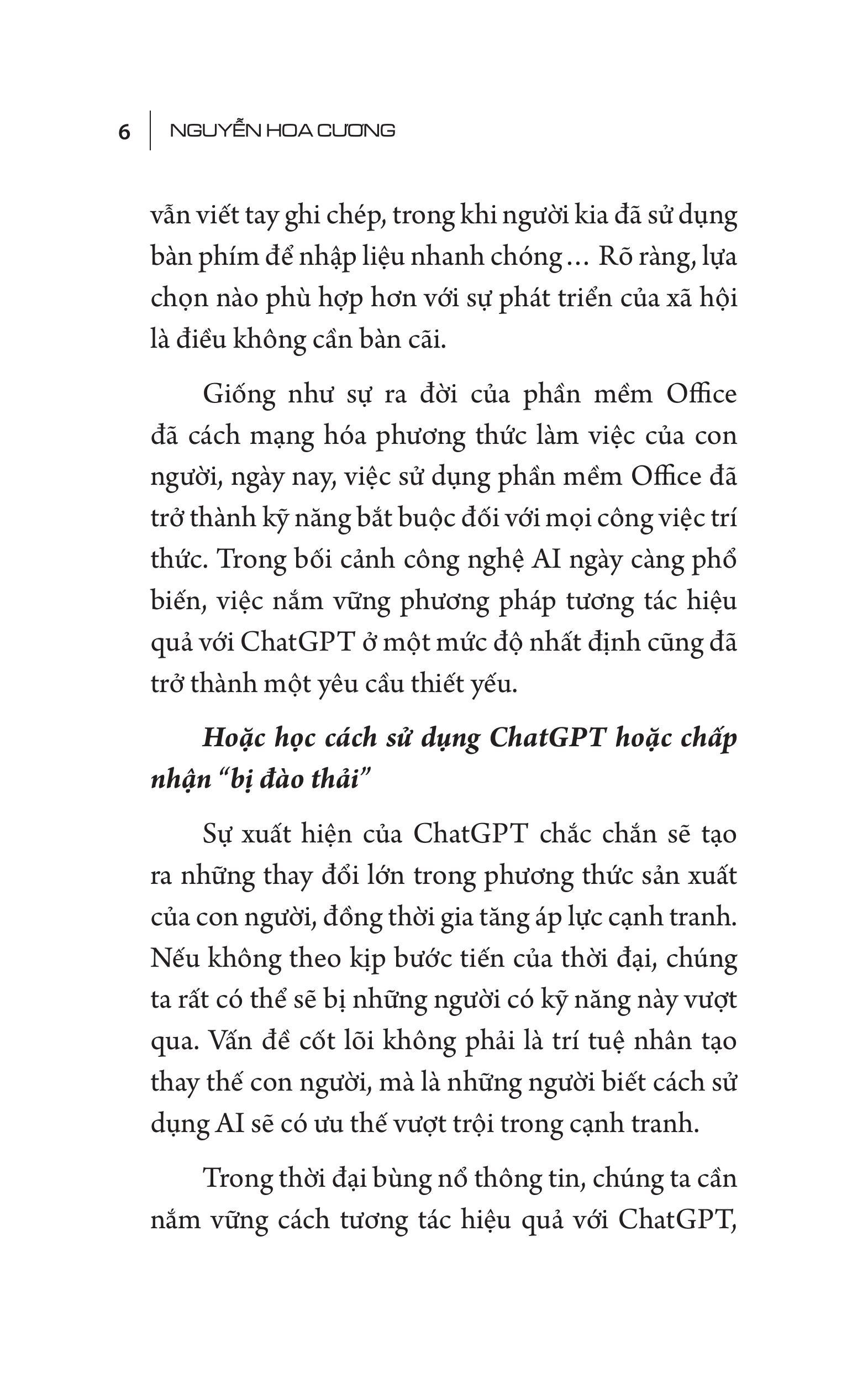 Nếu có thể tận dụng ChatGPT một cách hiệu quả, chúng ta chắc chắn sẽ đạt được những bước tiến quan trọng trong việc nâng cao năng suất lao động, tiết kiệm thời gian làm việc, cải thiện hiệu quả học tập và giải quyết các vấn đề trong cuộc sống. Đây cũng chính là ý nghĩa và giá trị cốt lõi của cuốn sách này.