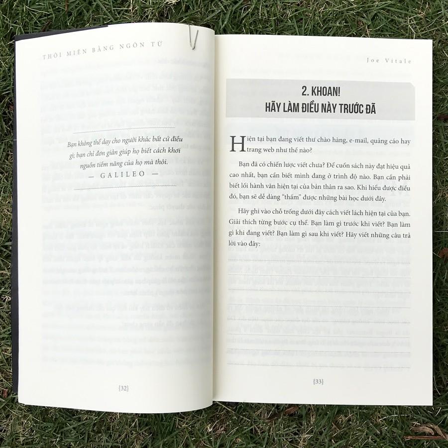 Thôi miên bằng ngôn từ (Bìa đen) Chắc hẳn bạn sẽ không muốn độc giả chìm vào giấc ngủ và tôi cũng vậy. “Thôi miên bằng ngôn từ”, theo tôi, là bất cứ cách viết lách nào khiến người đọc không thể cưỡng lại mà cứ đọc, đọc nữa, đọc mãi. Những câu chữ khiến mắt bạn dán chặt vào trang sách. Ngôn từ mạch lạc, súc tích, và hiệu quả, lôi cuốn bạn đọc hết từng từ, từng chữ một. Và hơn thế nữa, Thôi miên bằng ngôn từ khiến bạn phải ghi nhớ – và hành động – theo những gì bạn đã đọc.