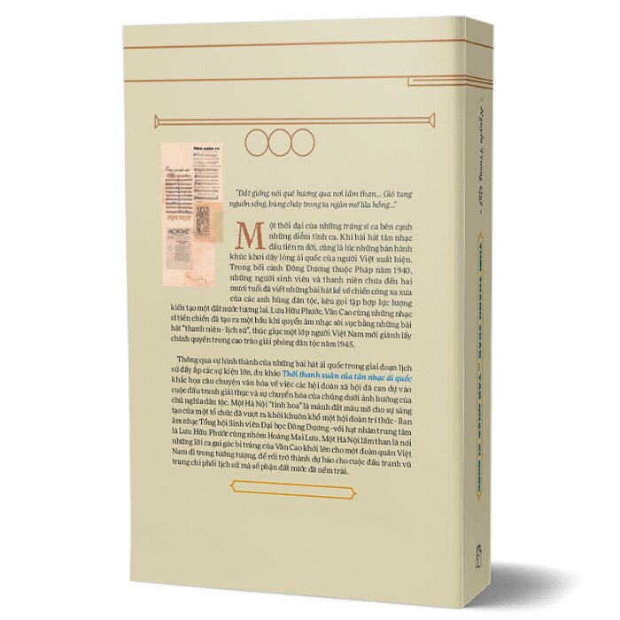 Thông qua sự hình thành của những bài hát ái quốc trong giai đoạn lịch sử đầy ắp các sự kiện lớn, du khảo Thời thanh xuân của tân nhạc ái quốc khắc họa câu chuyện văn hóa về việc các hội đoàn xã hội đã can dự vào cuộc đấu tranh giải thực và sự chuyển hóa của chúng dưới ảnh hưởng của chủ nghĩa dân tộc. Một Hà Nội “tinh hoa” là mảnh đất màu mỡ cho sự sáng tạo của một tổ chức đã vượt ra khỏi khuôn khổ một hội đoàn trí thức - Ban âm nhạc Tổng hội Sinh viên Đại học Đông Dương - với hạt nhân trung tâm là Lưu Hữu Phước cùng nhóm Hoàng MaiLưu. Một Hà Nội lầm than là nơi những lời ca gai góc bitráng của Văn Cao khởi lên cho một đoàn quân Việt Nam đi trong tưởng tượng, để rồi trở thành dự báo cho cuộc đấu tranh vũ trang chi phối lịch sử mà số phận đất nước đã nếm trải.