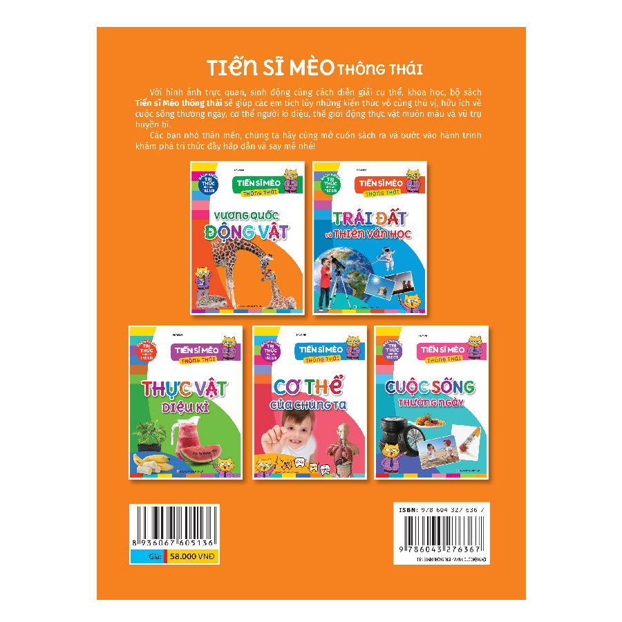 Với hình ảnh trực quan, sinh động cùng cách diễn giải cụ thể, khoa học, bộ sách Tiến sĩ Mèo thông thái sẽ giúp các em tích lũy những kiến thức vô cùng thú vị, hữu ích về cuộc sống thường ngày, cơ thể người kì diệu, thế giới động thực vật muôn màu và vũ trụ huyền bí.
