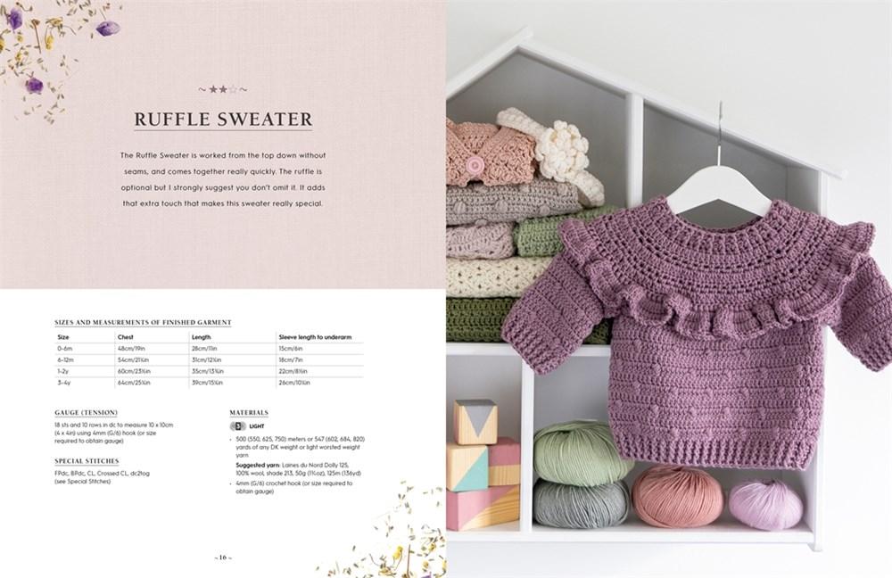 ---------------------------------------- Crochet a modern yet classic layette for baby's first years with this exquisite collection of patterns from Vita Apala, the popular designer behind Mon Petit Violon. In this value-packed collection of 20 crochet patterns, sutble colours, gorgeous yarns, rich textures, beautiful ruffles, and delicate motifs combine to create the most adorable wardrobe imaginable for babies and toddlers up to age 4. Beautifully photographed and with fully illustrated step-by-step instructions, the collection includes rompers, dresses, sweaters, cardigans, and hoos, as well as an heirloom cot blanket, booties and bonnet, so that you can crochet a complete and truly chic baby wardrobe with ease. There are designs for little girls and boys, and a large number of the designs are completely gender neutral. Baby and toddler garments and accessories are fun to crochet because they are quick to make and very rewarding. They require less yarn too, making them an accessible and speedy project that will still be valued enormously - the ultimate handmade baby gift. Crochet designer Vita Apala, better known as Mon Petit Violon, has been delighting crocheters with her baby designs for decades, having sold over 150,000 patterns on Etsy with five stars reviews. Her patterns, which are written in US crochet terms, are renowned for being exceptionally well put together, with everything explained in detail, step-by-step photos throughout so you can compare your progress as you follow along, and with all the working out done for you. As well as the extensive pattern collection, at the back of the book is a detailed techniques section, where you will learn all the basic and special stitches needed to create the amazing textures, including ribbing, ruffles, bobbles, shells and more. This comprehensive guide to baby crochet will give you a wealth of patterns at your fingertips, allowing you to hone your skills on a small scale while making garments that the little people in your life will love to be seen in.