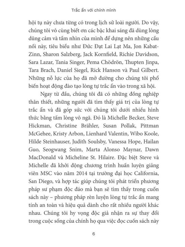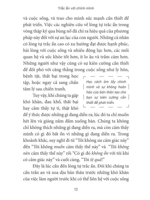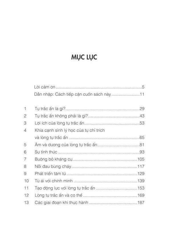 Trắc ẩn với chính mình là cuốn sách dựa trên cơ sở khoa học, bao gồm các bài thiền có hướng dẫn; tập quán thức có thể thực hiện mọi lúc, mọi nơi. Qua đó bạn sẽ biết cách thoát khỏi những phán xét gay gắt về bản thân và những tiêu chuẩn bất khả thi, nhằm giải quyết căng thẳng trong mối quan hệ cũng như các vấn đề thể chất lẫn tinh thần khác để nuôi dưỡng cảm giác hạnh phúc.
