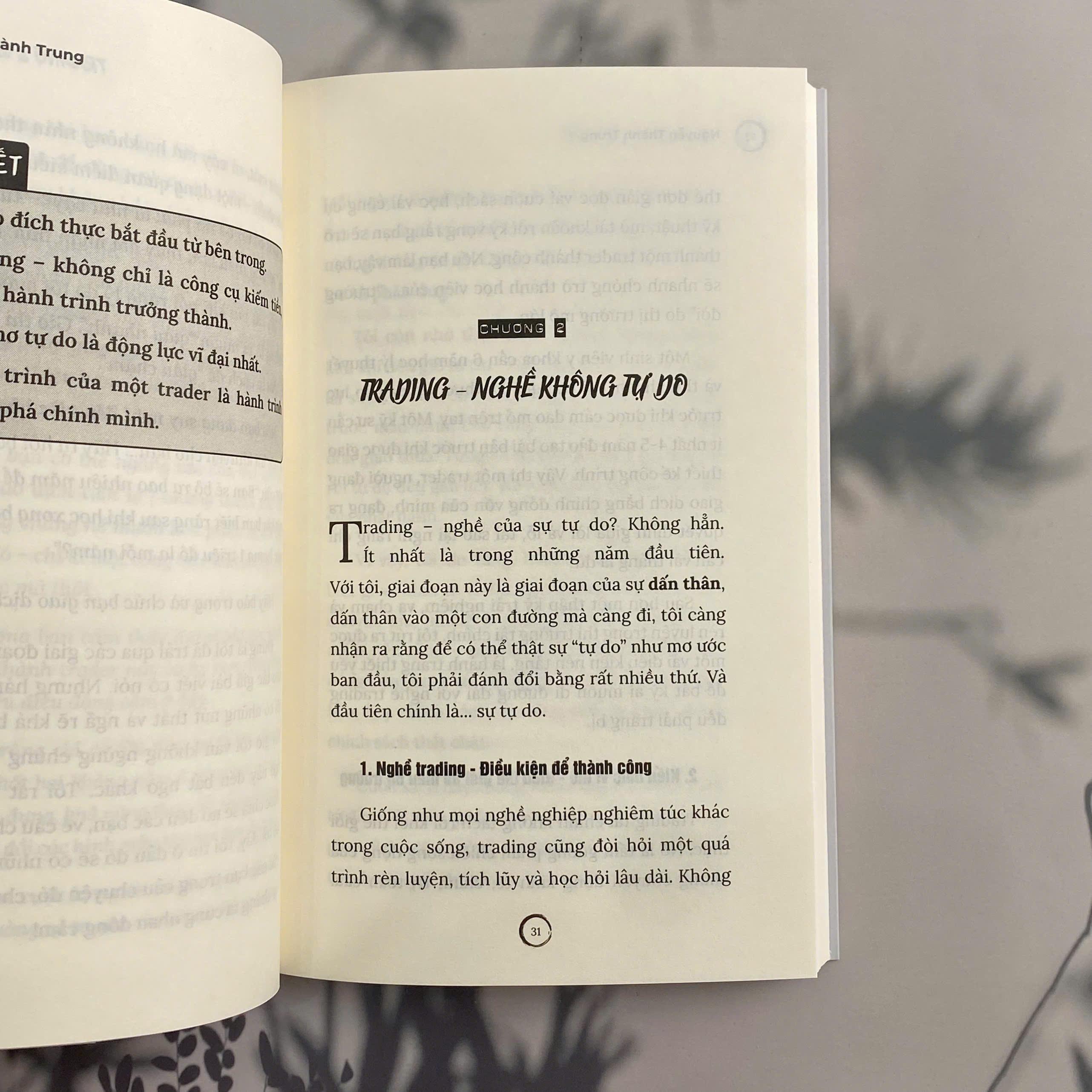 • Và cuối cùng là “Đạo”, con đường quay về với sự sáng rõ, bình an và tự do thật sự. Đây là cuốn sách dành cho: Những trader từng nhiều lần “cháy tài khoản” đến tuyệt vọng. Những ai mải miết chạy theo tự do vật chất mà quên mất sự tự do tâm hồn. Và những người đang tìm kiếm một con đường tỉnh thức giữa cuộc sống hiện đại đầy biến động. Cuốn sách đưa ra một góc nhìn rất “người”, rất chân thực về trading - không phải chỉ là phân tích kỹ thuật, mô hình nến hay quản lý vốn, mà là hành trình trưởng thành, học cách kỷ luật, chấp nhận sai lầm, vượt qua cảm xúc và cuối cùng là tìm thấy “đạo”, con đường về với sự bình an nội tại. “Bạn không thể kiểm soát thị trường, nhưng bạn có thể kiểm soát chính m.ình.” “Trading & Con đường Đạo” là cuốn sách giúp bạn hiểu rằng: hành trình kiếm tiền và hành trình trở thành một con người trọn vẹn, đôi khi chỉ là một.