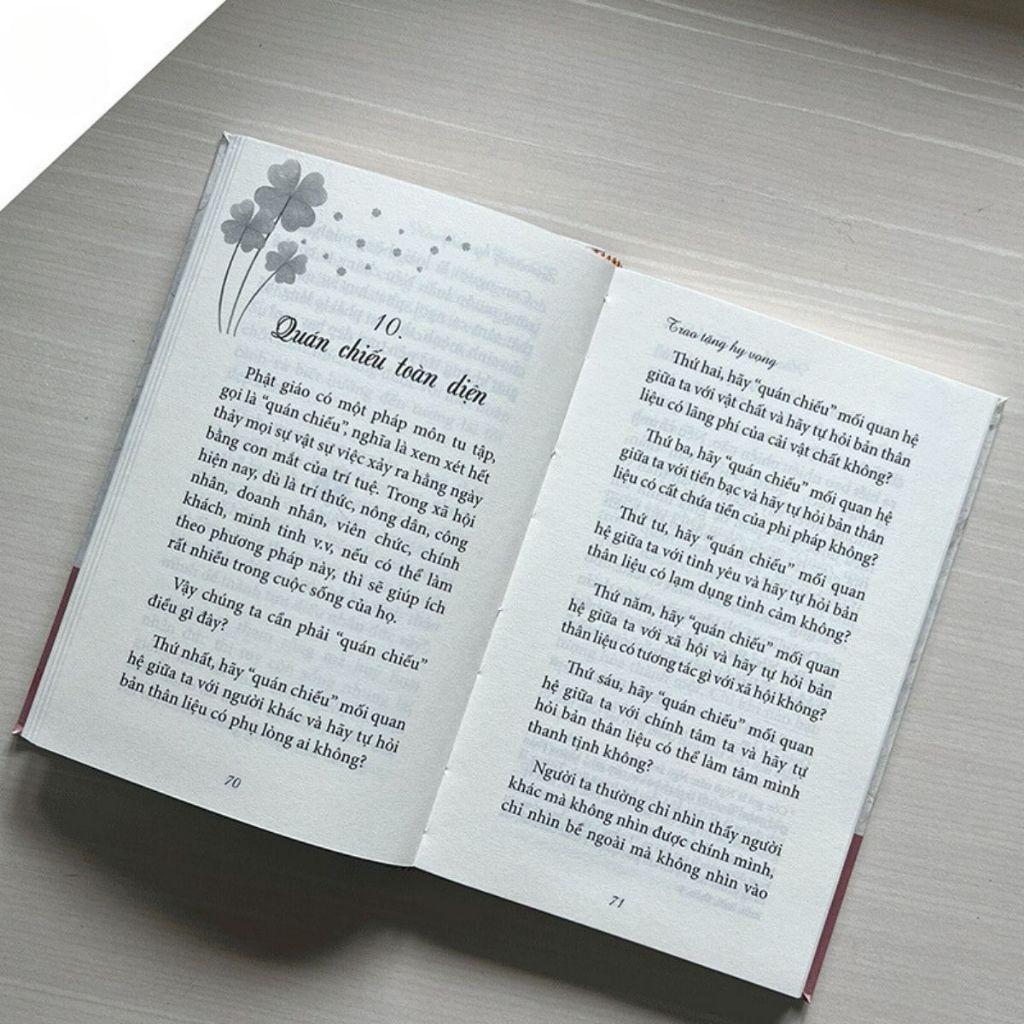 Chủ đề "Trao tặng hy vọng" xuyên suốt tập sách không chỉ là lời nhắc nhở mà còn là lời động viên mạnh mẽ. Hy vọng chính là ngọn đèn soi sáng, là động lực để con người vượt qua những khó khăn và tìm thấy ý nghĩa trong mỗi thử thách. Chương cuối cùng, “Trao tặng hy vọng”, mang thông điệp rằng mỗi người đều có thể trở thành nguồn cảm hứng, gieo mầm yêu thương và hy vọng cho những người xung quanh.
