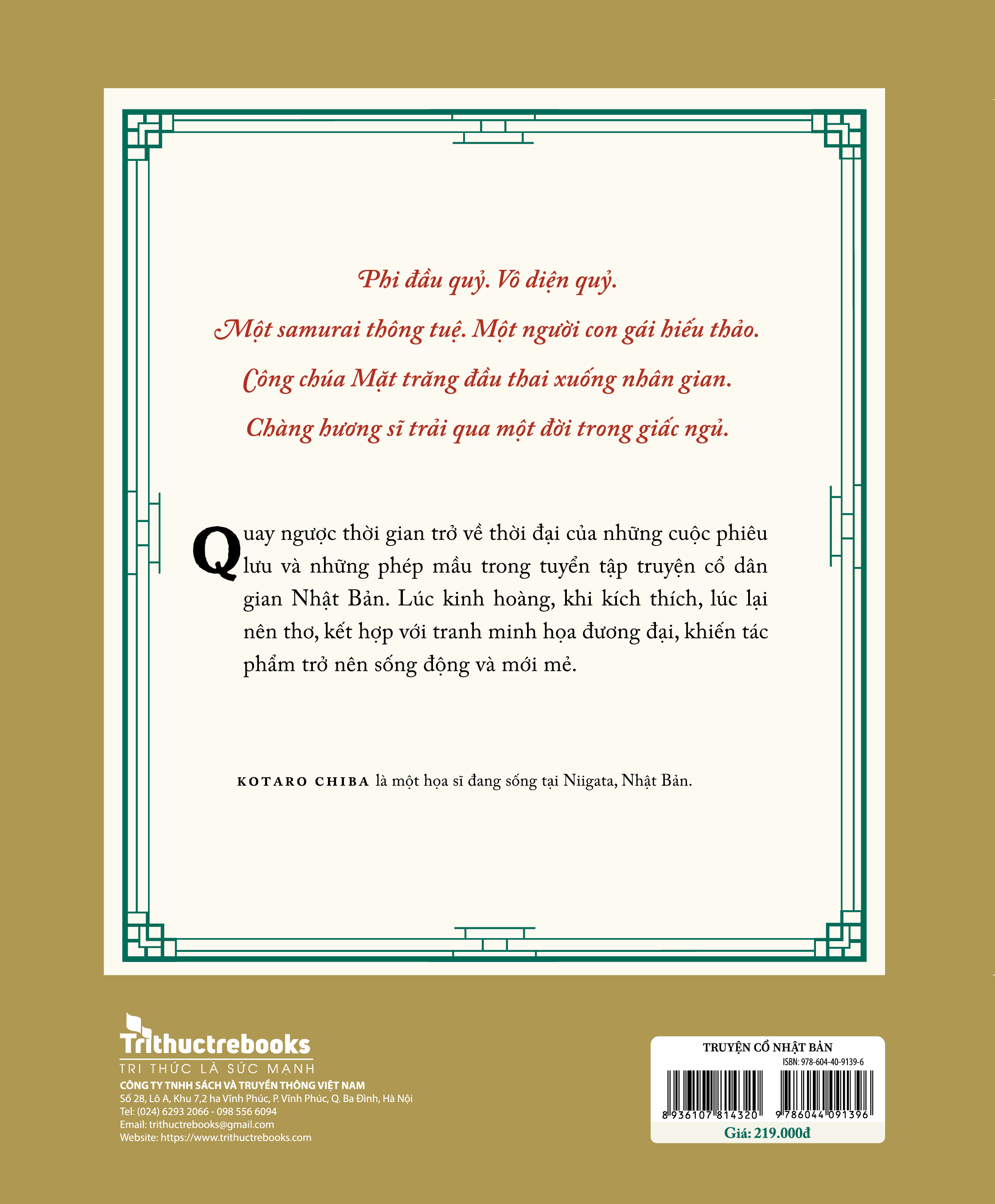 - THÔNG TIN SÁCH Tên sách: Truyện cổ Nhật Bản Thể loại: Văn học Tác giả: Nhiều tác giả Khổ sách: 19*23 cm Số trang: 212 Hình thức: Bìa mềm Giá bìa: 219.000 đ Số ISBN: 978-604-40-9139-6 Mã vạch: 8936107814320