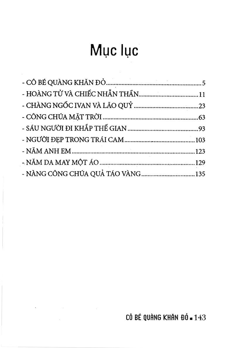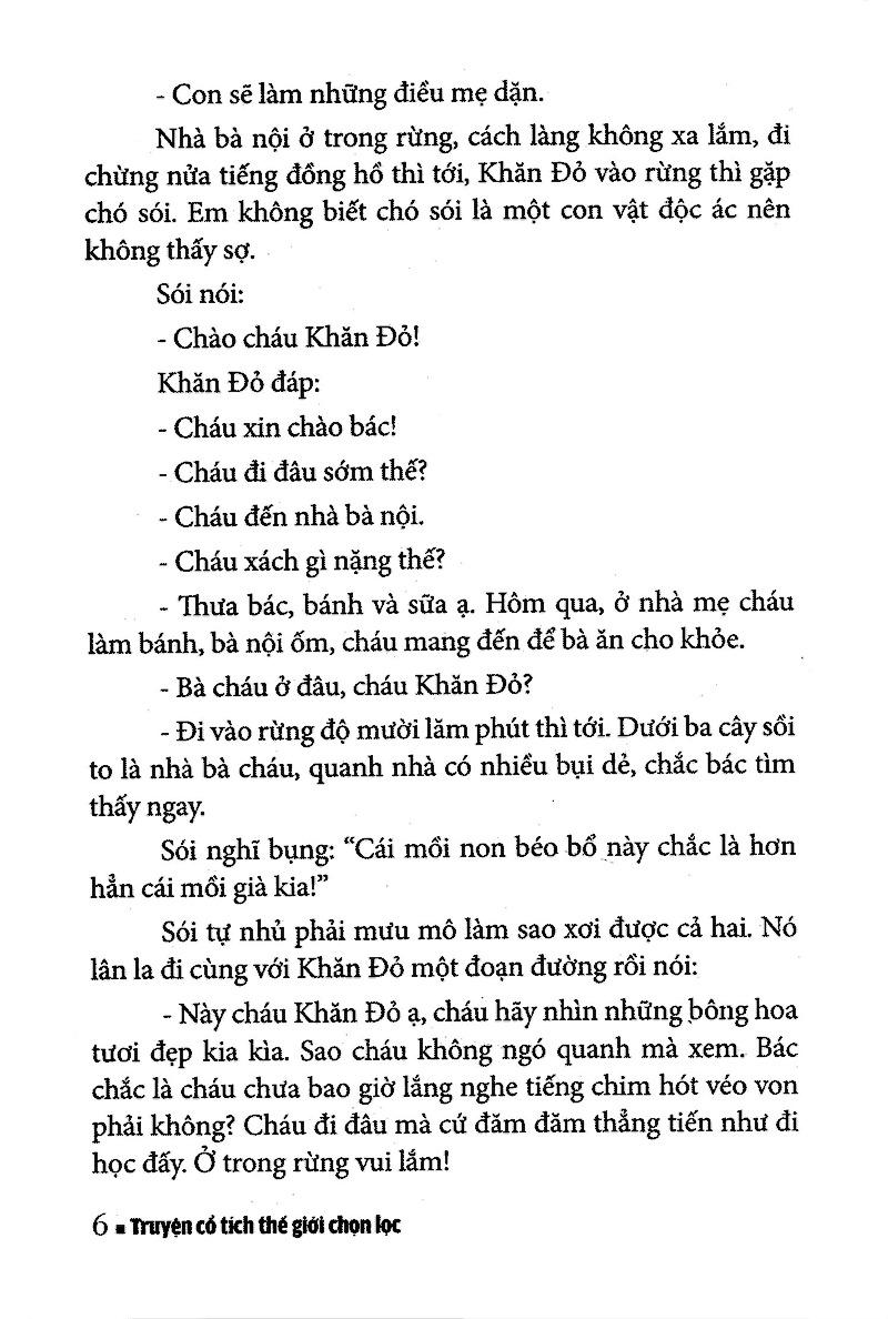 Truyện Cổ Tích Thế Giới Chọn Lọc - Cô Bé Quàng Khăn Đỏ kể về ngày xửa ngày xưa, có một cô bé rất là ngoan ngoãn ai cũng yêu mến nhất là bà, bà tặng cho cô bé một chiếc khăn màu đỏ. Cô bé thích lắm ngày nào cũng quàng chiếc khăn, nên mọi người thường gọi cô là "cô bé quàng khăn đỏ". Một hôm, bà Khăn Đỏ bị ốm, mẹ dặn Khăn Đỏ mang bánh và trái cây đến cho bà. Nhưng Khăn Đỏ lại có tính ham chơi nên đã quên bẵng đi lời mẹ dặn không đi thẳng mà lại đi đường vòng...