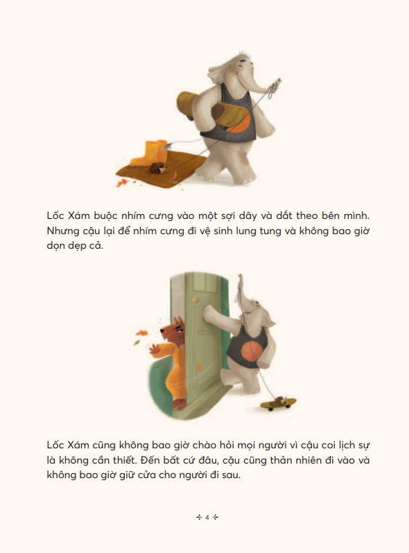 Cuốn Voi con biết tôn trọng mọi người: Cuốn sách kể về bạn voi con thường hành động thô lỗ, thiếu tôn trọng người khác. Để giúp voi con nhận ra lỗi của m.ình, cô cú thông thái đã giúp voi con đặt m.ình vào vị trí của người khác để thấu hiểu họ. Nhờ vậy mà voi con đã hiểu ra và thay đổi rất nhiều trong cách cư xử, hành động. Cậu trở nên tốt bụng, lịch sự và biết tôn trọng mọi người.