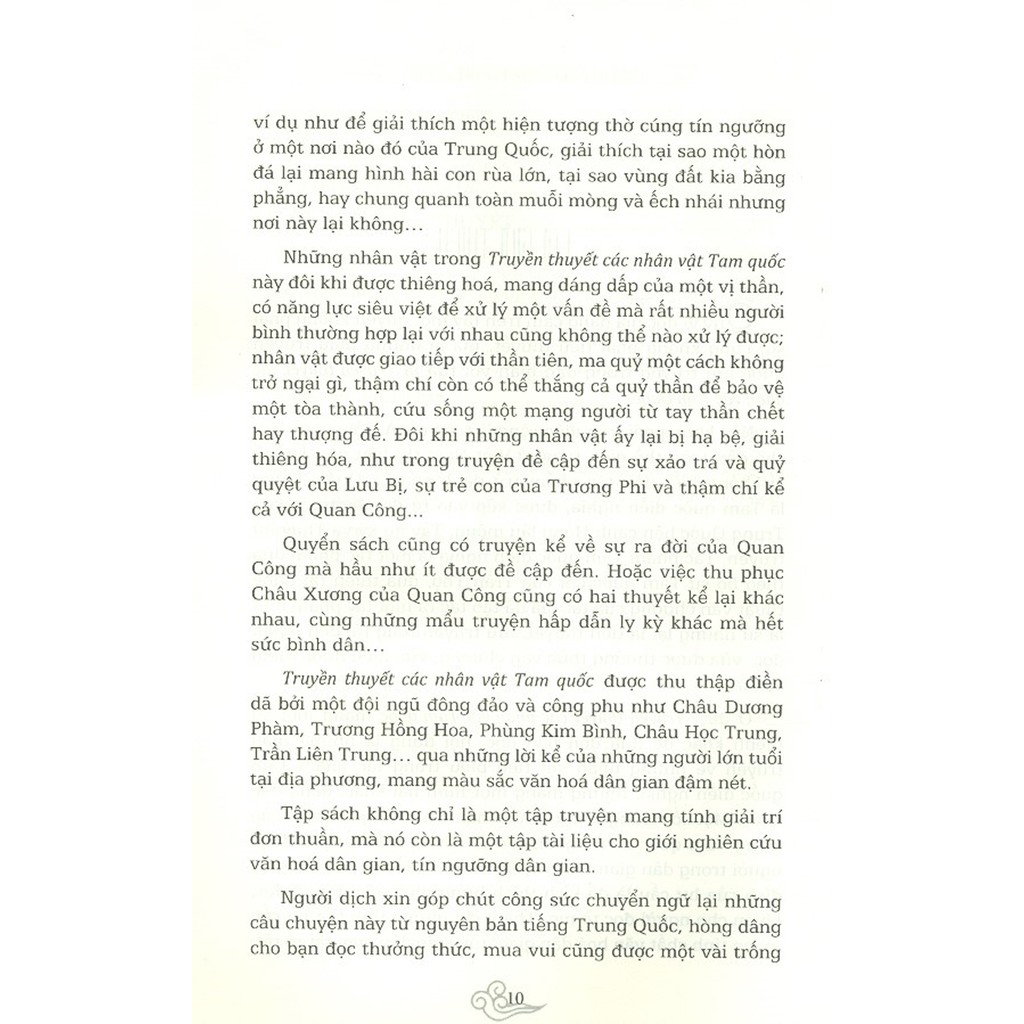Nội dung "Nếu không nói trên diện rộng là toàn cõi Á Đông này, hay cho đến toàn thế giới, riêng ở Việt Nam thì hầu như không ai không biết đến tác phẩm trứ danh của La Quán Trung là Tam quốc diễn nghĩa, được xếp vào tứ đại danh tác của Trung Quốc bên cạnh Hồng lâu mộng, Tây du ký và Thuỷ hử truyện. Tác phẩm Tam quốc diễn nghĩa là một tác phẩm dựa theo bộ sử Tam quốc chí của Trần Thọ, qua tài nghệ văn chương của tác giả đã tạo tác ra một tác phẩm như là sử nhưng lại là tiểu thuyết, lưu truyền rộng rãi đến người đọc, vừa được thưởng thức văn chương, vừa hiểu được thêm về sử. Ở đây, Truyền thuyết các nhân vật Tam quốc mang một sứ mệnh khác, nội dung cuốn sách là những mẩu truyện về những nhân vật tiêu biểu trong tác phẩm Tam quốc diễn nghĩa, nhưng mang một hình hài khác, dáng dấp khác. Một số những tình tiết về nhân vật không được đề cập trong Tam quốc diễn nghĩa, tức là những mẩu truyện được người trong dân gian lưu truyền, hầu hết đều là hư cấu, mục đích của hư cấu là để kích thích hưng phấn cho người đọc, khiến cho người đọc tò mò. Thậm chí những tình tiết hư cấu mang tính chất văn hoá dân gian, tôn giáo dân gian rất rõ rệt, ví dụ như để giải thích một hiện tượng thờ cúng tín ngưỡng ở một nơi nào đó của Trung Quốc, giải thích tại sao một hòn đá lại mang hình hài con rùa lớn, tại sao vùng đất kia bằng phẳng, hay chung quanh toàn muỗi mòng và ếch nhái nhưng nơi này lại không… Những nhân vật trong Truyền thuyết các nhân vật Tam quốc này đôi khi được thiêng hoá, mang dáng dấp của một vị thần, có năng lực siêu việt để xử lý một vấn đề mà rất nhiều người bình thường hợp lại với nhau cũng không thể nào xử lý được; nhân vật được giao tiếp với thần tiên, ma quỷ một cách không trở ngại gì, thậm chí còn có thể thắng cả quỷ thần để bảo vệ một tòa thành, cứu sống một mạng người từ tay thần chết hay thượng đế. Đôi khi những nhân vật ấy lại bị hạ bệ, giải thiêng hóa, như trong truyện đề cập đến sự xảo trá và quỷ quyệt của Lưu Bị, sự trẻ con của Trương Phi và thậm chí kể cả với Quan Cô Quyển sách cũng có truyện kể về sự ra đời của Quan Công mà hầu như ít được đề cập đến. Hoặc việc thu phục Châu Xương của Quan Công cũng có hai thuyết kể lại khác nhau, cùng những mẩu truyện hấp dẫn ly kỳ khác mà hết sức bình dân… Truyền thuyết các nhân vật Tam quốc được thu thập điền dã bởi một đội ngũ đông đảo và công phu như Châu Dương Phàm, Trương Hồng Hoa, Phùng Kim Bình, Châu Học Trung, Trần Liên Trung… qua những lời kể của những người lớn tuổi tại địa phương, mang màu sắc văn hoá dân gian đậm nét. Tập sách không chỉ là một tập truyện mang tính giải trí đơn thuần, mà nó còn là một tập tài liệu cho giới nghiên cứu văn hoá dân gian, tín ngưỡng dân gian."
