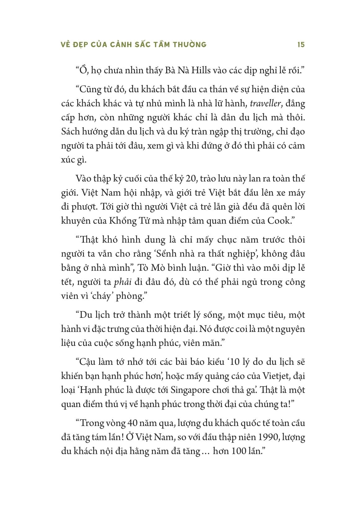 Đó là những gì đôi bạn tuổi trẻ: Tò Mò và Suy Ngẫm đã chia sẻ với nhau trong cuộc đối thoại độc đáo và lôi cuốn xuyên suốt hành trình mà cuốn sách Vẻ đẹp của cảnh sắc tầm thường của tác giả Đặng Hoàng Giang kể lại. Đó là hành trình theo không gian: từ rừng xuống biển, từ những cảnh quan trác tuyệt cho đến những cảnh sắc bình thường như đầm lầy, bãi cỏ, cánh đồng hoang, từ lúc đẹp trời đến cả lúc xấu trời, từ ngày mưa đến ngày nắng… Nhưng đó còn là hành trình theo chiều lịch đại, đi dọc lịch sử của những cách thức đến với thiên nhiên trong quá khứ, từ hàng nghìn năm trước đến nay, trong mối tương quan với quan điểm thẩm mĩ, bối cảnh xã hội và tư tưởng các thời đại khác nhau để lần ra gốc tích những quan niệm cái đẹp mà ngày nay người ta xem là hiển nhiên.