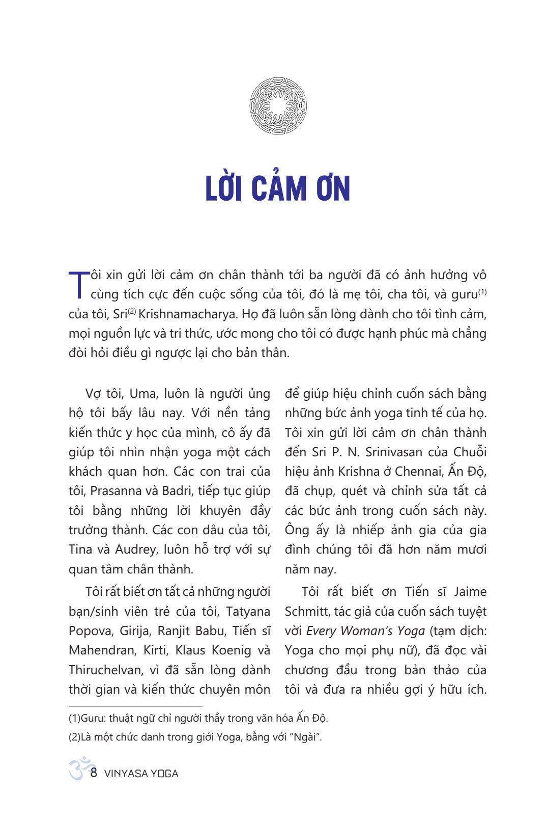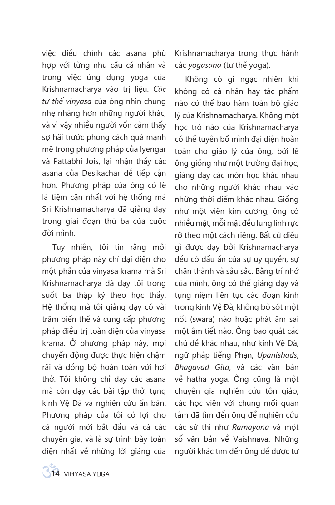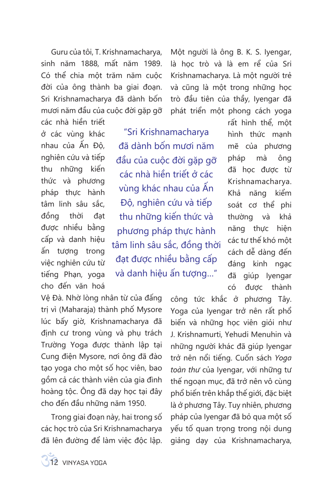 Phần mở đầu của sách là những chia sẻ của tác giả về quá trình 33 năm học tập dưới trướng T. Krishnamacharya, người sáng tạo ra trường phái Vinyasa yoga, và cùng với những chia sẻ cá nhân của ông sau hơn hai thập kỷ làm việc dưới cương vị giáo viên Yoga. Sau đó chúng ta đến nội dung chính của cuốn sách là 12 chương tương ứng cho 12 trình tự động tác cùng với 1000 ảnh màu minh họa rõ nét động tác và quy trình thở dưới những lời hướng dẫn chi tiết của tác giả.