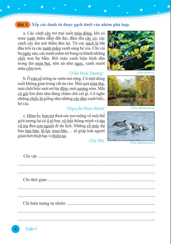 Phần 1: BÀI TẬP. Phần này được biên soạn theo từng mục tiêu ứng với từng tuần học trong chương trình, sách giáo khoa Tiếng Việt 4 - Cánh Diều. Với hệ thống bài tập đa dạng, ngữ liệu mới mẻ được chọn lọc cẩn thận nhằm giúp học sinh rèn luyện, phát triển kiến thức, kĩ năng dùng từ, đặt câu, sử dụng dấu câu và biện pháp tu từ hiệu quả.