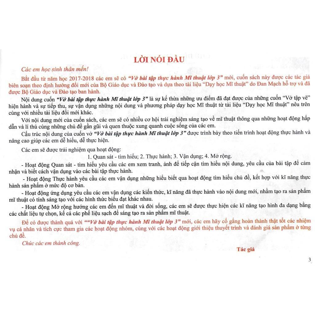 Bắt đầu từ năm học 2017-2018 các em sẽ có Vở Bài Tập Thực Hành Mĩ Thuật Lớp 3 (Biên Soạn Theo Chương Trình GDPT Mới) mới, cuốn sách này được các tác giả biên soạn theo định hướng đổi mới của Bộ Giáo dục và Đào tạo và dựa theo tài liệu “Dạy học Mĩ thuật” do Đan Mạch hỗ trợ và đã được Bộ Giáo dục và Đào tạo ban hành.