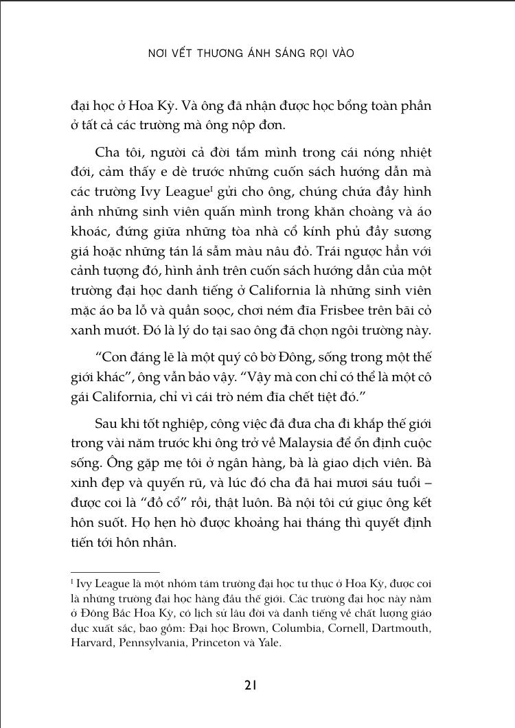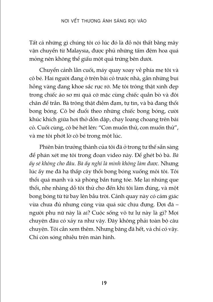 “Nơi vết thương ánh sáng rọi vào” không liệt kê bản danh sách những điều bạn cần làm. Thay vào đó, bạn sẽ tìm thấy kinh nghiệm xương máu từ chính những sai lầm của người trong cuộc. Ở đó, bạn sẽ tìm thấy kiến thức chuyên môn được trích dẫn khéo léo, tinh gọn. Sự sắc bén của một nhà báo và sự nhạy cảm của một Stephanie dị biệt như tiếp thêm cho bạn sức mạnh. Sau cùng, hãy nhớ, khi bạn khát khao yêu thương, được yêu thương và tự yêu thương, bạn có thể tự chữa lành chính m.ình.