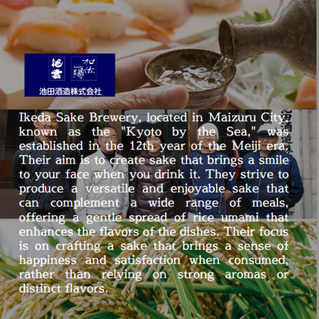 Sử dụng từ gạo YAMADA NISHIKI 100%. Đây là một loại r'ượu Sake sang trọng từ Maizuru, phía bắc Kyoto. Được ủ bởi nhà sản xuất bia Kyoji Ikeda với Gạo Yamada Nishiki được trồng hữu cơ tại địa phương, sau đó được đánh bóng xuống 35%. Sake có hương vị ngọt ngào với hậu vị kéo dài đặc biệt. Yamada Nishiki được lên men từ từ ở nhiệt độ thấp và vắt nhẹ.
