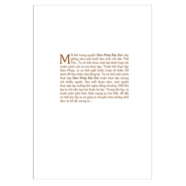 Mua tại TiktokMỗi bài trong quyển Sám Pháp Địa Xúc này giống như một buổi tâm tình với đức Thế Tôn. Ta có thể chọn một bài thích hợp với hoàn cảnh của ta mà thực tập. Trước khi thực tập Sám Pháp, ta có thể ngồi thiền hoặc đi thiền 30 phút để làm thân tâm lắng lại. Ta có thể một mình thực tập Sám Pháp Địa Xúc hoặc thực tập chung với nhiều người. Sau mỗi đoạn sám, mọi người thực tập lạy xuống khi nghe tiếng chuông. Mỗi lần lạy ta chỉ nên lạy hai hoặc ba lạy. Trong khi lạy, ta hoàn toàn phú thác thân mạng ta cho Đất, để đất có thể ôm lấy ta và giúp ta chuyển hóa những khổ đau và bế tắc trong ta...