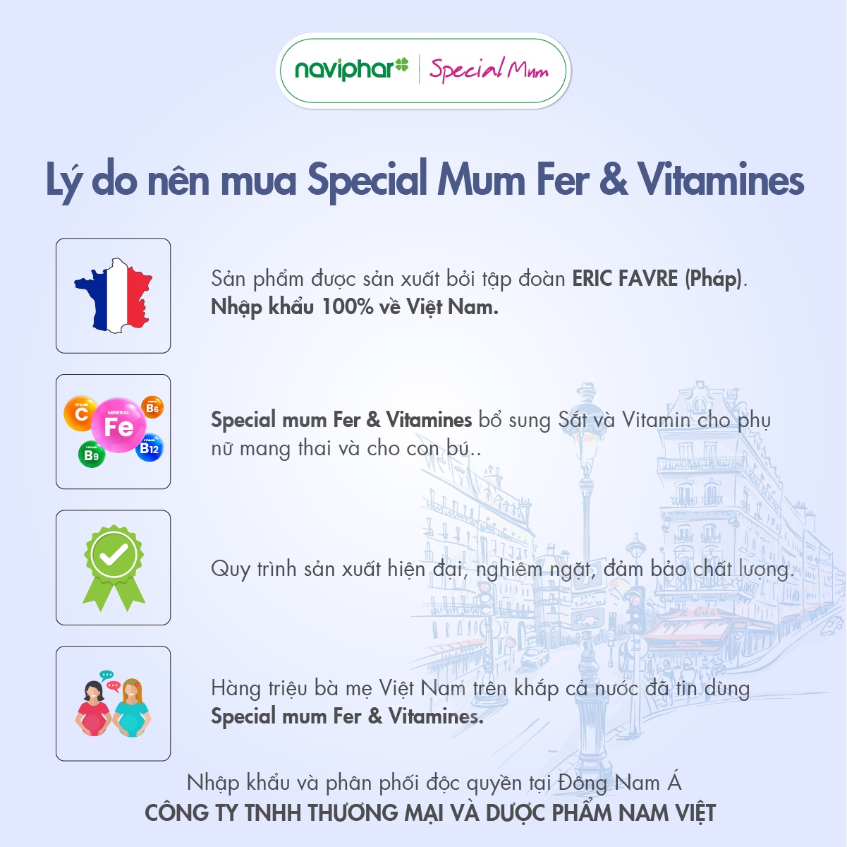 Special Mum - Dòng sản phẩm chuyên khoa hoàn hảo cho mẹ đến từ tập đoàn Eric Favre - Pháp danh tiếng. Các sản phẩm Special Mum giúp mẹ bổ sung các dưỡng chất thiếu yếu từ khi có ý định mang thai, đồng hành cùng mẹ trong suốt thai kỳ và giai đoạn sau sinh. Special Mum cam kết mang lại cho mẹ những trải nghiệm tuyệt vời nhất trên hành trình thai kỳ hạnh phúc. Special Mum Fer & Vitamines được bào chế chuyên biệt dành cho mẹ, mùi vị dễ chịu, chỉ cần sử dụng 1 lần/ngày. Tiết kiệm. Dễ nhớ
