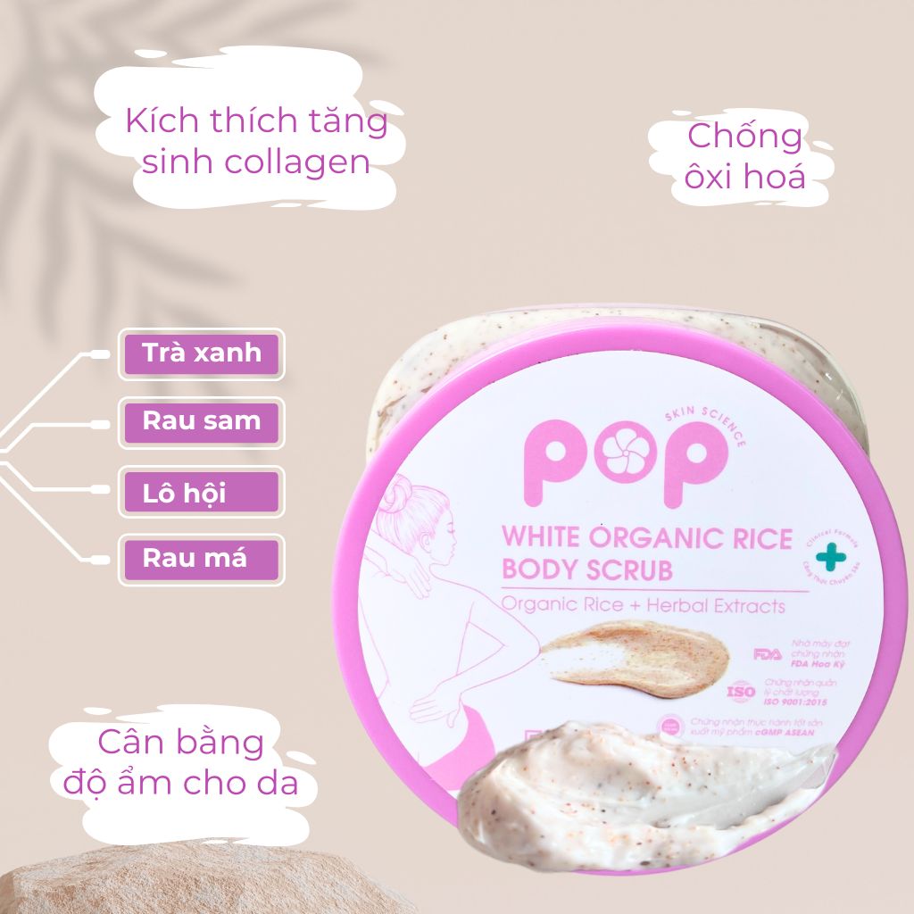 Tẩy Tế Bào Da Chết Gạo Hữu Cơ Sạch Sâu Sáng Mịn POP Làn da của cơ thể chúng ta luôn có cơ chế tự nhiên nhiên là thay thế và phục hồi những tế bào mới liên tục. Tuy nhiên, do nhiều tác động xấu từ bên ngoài như thời tiết, môi trường hay thói quen chăm sóc da không tốt sẽ ảnh hưởng rất nhiều đến hoạt động của cơ chế này. Và nếu bạn không tẩy tế bào chết cho da thường xuyên mỗi tuần thì da sẽ rất khó hấp thụ được những dưỡng chất có trong các sản phẩm chăm sóc da và sẽ gây ra nguy cơ làm bít tắc lỗ chân lông đấy.Vì thế, việc tẩy tế bào da chết thường xuyên và điều đặn sẽ giúp da của bạn sản sinh tế bào da mới thường xuyên, để da luôn được căng bóng, sáng mịn và tràn đầy sức sống. Tẩy tế bào da chết gạo hữu cơ POP rất giàu dưỡng chất từ thiên nhiên như chiết xuất trà xanh, rau má, lô hội, … không chỉ loại bỏ sạch những bụi bẩn, bã nhờn, tế bào da chết mà còn giúp cải thiện làn da của bạn từ sâu bên trong, mang lại làn da mịn màng, tươi sáng và săn chắc. Loại bỏ triệt để tế bào da chết cứng đầu, mụn đầu đen, mụn cám. Làm sạch bụi bẩn và bã nhờn trên da, giúp thông thoáng lỗ chân lông, ngăn ngừa nguy cơ bị mụn ẩn, mụn viêm. Thúc đẩy sự phát triển, tái sinh của mô da, kích thích tăng sinh collagen, mang lại làn da hồng hào, săn chắc. Cân bằng độ ẩm của da, thành phần kháng viêm và chống ôxi hoá nguồn gốc tự nhiên bảo vệ da khỏi tác hại từ tia UV và môi trường xung quanh. Thành phần chính: