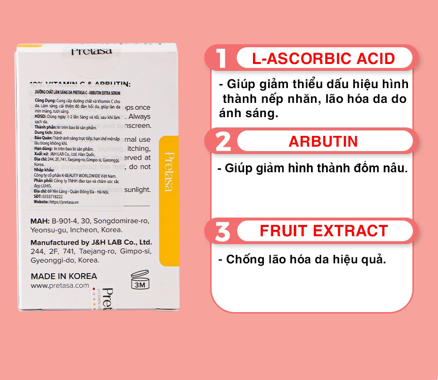 Hoạt động như một chiếc áo giáp chống lại nhiễm trùng và các gốc tự do khác: các chất chống oxy hóa có trong Pretasa vitamin C Arbutin sẽ giúp làn da của bạn chống lại các gốc tự do, giúp giữ cho làn da của bạn tươi trẻ. Các đốm đen trên da, các lớp da chết cũng dần mất đi nhờ tác dụng của Vitamin Serum. Thành phần chính Serum Pretasa C-Arbutin Extra Serum L – ascorbic 10%