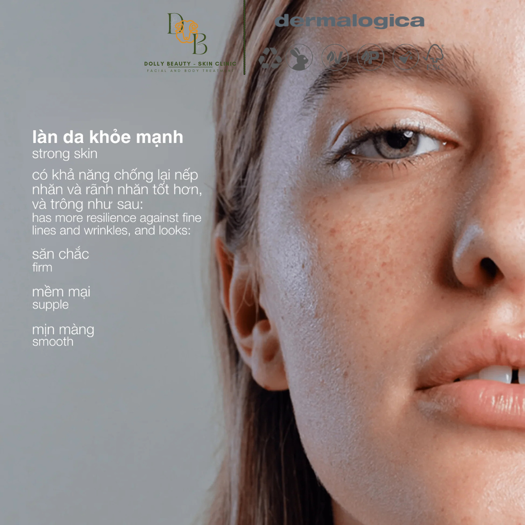 Serum tái tạo hàng rào bảo vệ, tăng cường khả năng phục hồi của da DYNAMIC SKIN STRENGTHENING SERUM của Dermalogica Chống lão hoá mạnh mẽ hơn: Tinh chất nuôi dưỡng đa tác động giúp tăng cường độ bền vững của hàng rào bảo vệ da để nâng cao khả năng chống chịu trước các tác nhân gây lão hóa. Tinh chất dạng sữa được tăng cường với công nghệ BioShield sử dụng peptide mô phỏng sinh học, chất chống oxy hóa và Squalane nhằm củng cố hàng rào phòng vệ của da. Chiết xuất từ cây Evergreen – loài cây có khả năng thích nghi với khí hậu khắc nghiệt – giúp cải thiện độ đàn hồi của da và mang lại vẻ ngoài săn chắc hơn. Chiết xuất kế sữa và chiết xuất quýt tái chế giúp phục hồi hàng rào bảo vệ da và hỗ trợ chống lại các dấu hiệu lão hóa. Hỗn hợp tảo đỏ cung cấp độ ẩm cho làn da trông khỏe mạnh và mềm mại hơn, đồng thời các chiết xuất thực vật giúp làm dịu da. "Age stronger: nourishing multi-defense serum builds barrier resilience to enhance endurance against skin-aging triggers. Milky serum powered by BioShield utilizes a biomimetic peptide, antioxidants and Squalane to help fortify barrier defenses. Evergreen Extract from a climate-resilient tree helps improve skin’s bounce-back and delivers a redensified look. Barrier-restoring Cotton Thistle and upcycled Tangerine Extract help skin recover and resist signs of aging. A blend with Red Microalgae hydrates for healthy-looking, more supple skin, while botanical extracts help soothe." Lợi ích