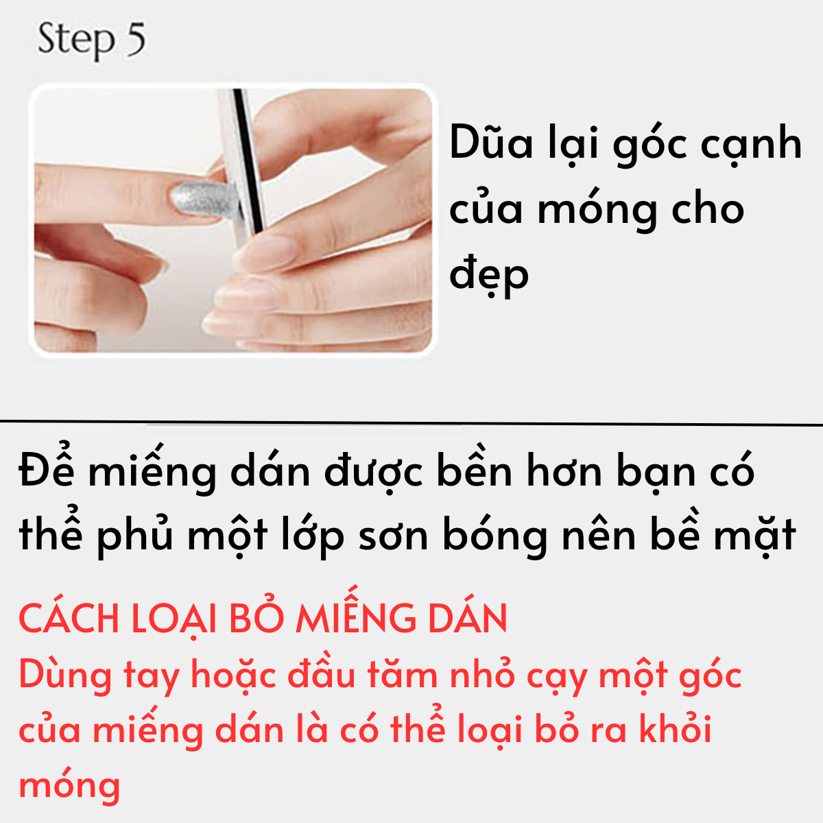 Lưu ý: Bộ sản phẩm chỉ có miếng dán và sẽ không bao gồm kéo, dũa bộ dụng cụ vệ sinh móng đi kèm ĐẶC ĐIỂM ️ Bạn mất thời gian với việc ra tiệm làm móng đợi chờ lâu mới tới lượt ️ Làm chung dụng cụ làm móng dễ lây bệnh ️ Miếng dán móng tay giúp bạn thay đổi kiểu dáng màu sắc nhanh chóng mà tiết kiệm chi phí và thời gian ️ Bạn có thể tự làm và thay đổi màu sắc mà bạn thích tùy tâm trạng của bạn ngày hôm đó ️ Miếng dán móng tay với chất liệu là silicon mỏng không gây kích ứng cho da ️ Đặc biệt miếng dán móng tay không có mùi hôi gây khó chịu cho người sử dụng ️ Không cần dùng keo dán mà vẫn dính trên móng của bạn. Do miếng dán móng đã có 1 lớp keo mỏng bên trong mà lớp keo này chuyên dành cho nail nên không gây tổn hại tới móng tay của bạn và người sử dụng ️ Việc gỡ bỏ cũng dể dàng bằng việc lấy 1 chiếc tăm cạy 1 góc là có thể tách ra khỏi móng của bạn một cách dễ dàng và đơn giản. ️ Độ bòng của miếng dán giống hoàn toàn với nước sơn móng tay thật ️ Nó được làm từ chất liệu polyurethane dẻo và chắc chắn nhưng vẫn duy trì độ bám dính mà không làm hỏng móng tay. ️ Hiệu quả: khoảng 14 ngày ( độ bền tùy vào từng người sử dụng sơn thêm một lớp sơn móng trong bên ngoài để được lâu hơn) ️ Độ bám dính tốt vừa vặn với móng thật nhing bên ngoài ko ai biết là miếng dán. ️ Đây là loại miếng dán được chứng nhận không chứa các thành phần gây hại và là sản phẩm an toàn đã được xác minh qua các thử nghiệm và thử nghiệm lâm sàng được chứng nhận bởi KCL và SGS của Hàn Quốc (dành cho trẻ từ 3 tuổi trở lên). Cách sử dụng: