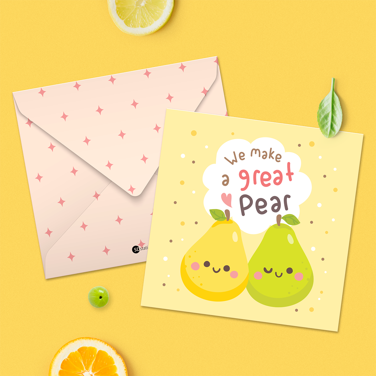 Thiệp FRUITY của SDstationery mang hình minh họa đáng yêu cùng những thông điệp ngọt ngào “hương vị trái cây” với cách chơi chữ tiếng Anh vui nhộn. Thiệp sẽ giúp bạn đốn tim crush trong nháy mắt bởi độ cute dí dỏm của nó.