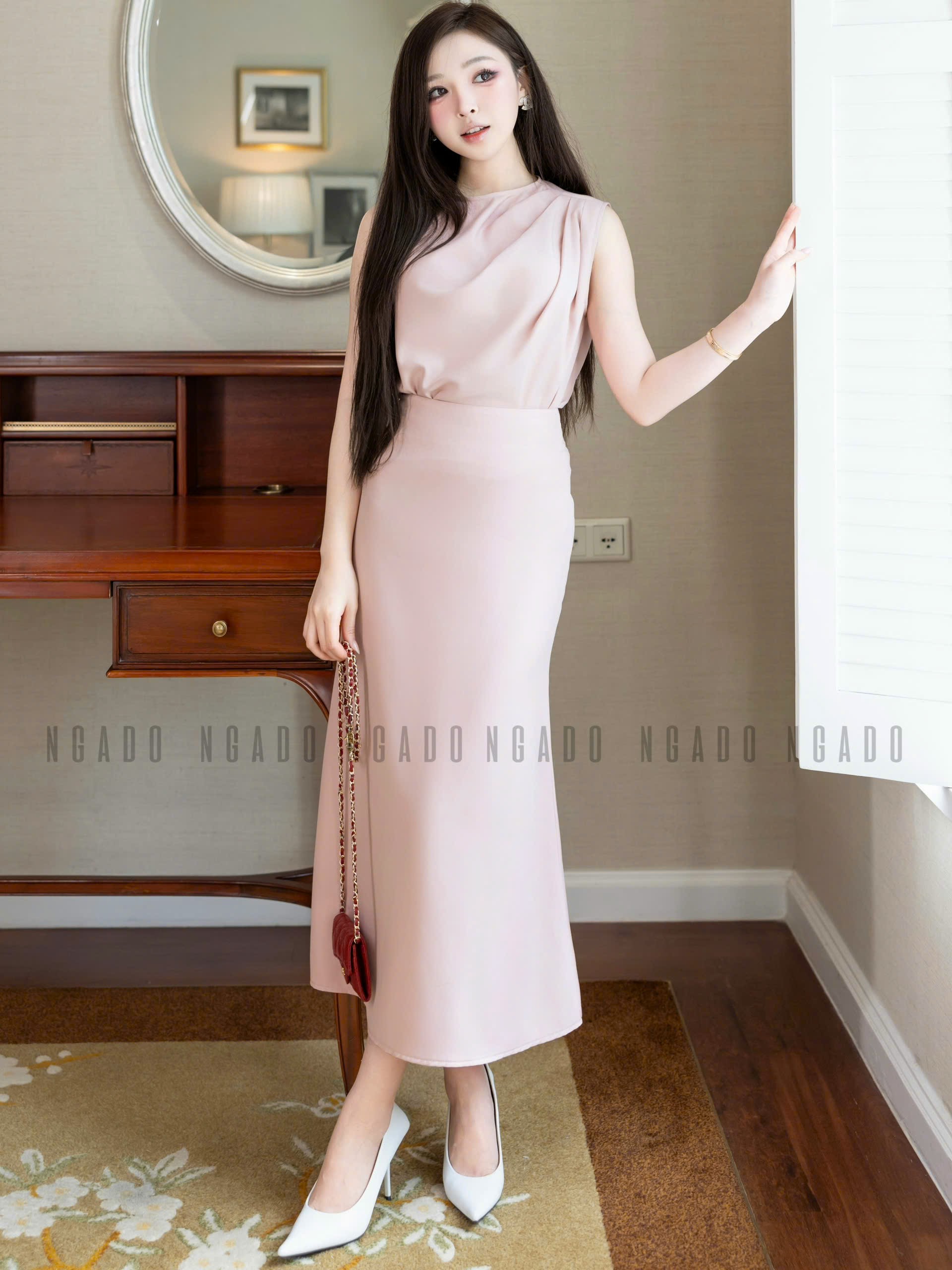 ✨Set áo váy hồng sát nách xếp ly NGADO , set áo váy dài , set áo váy hồng