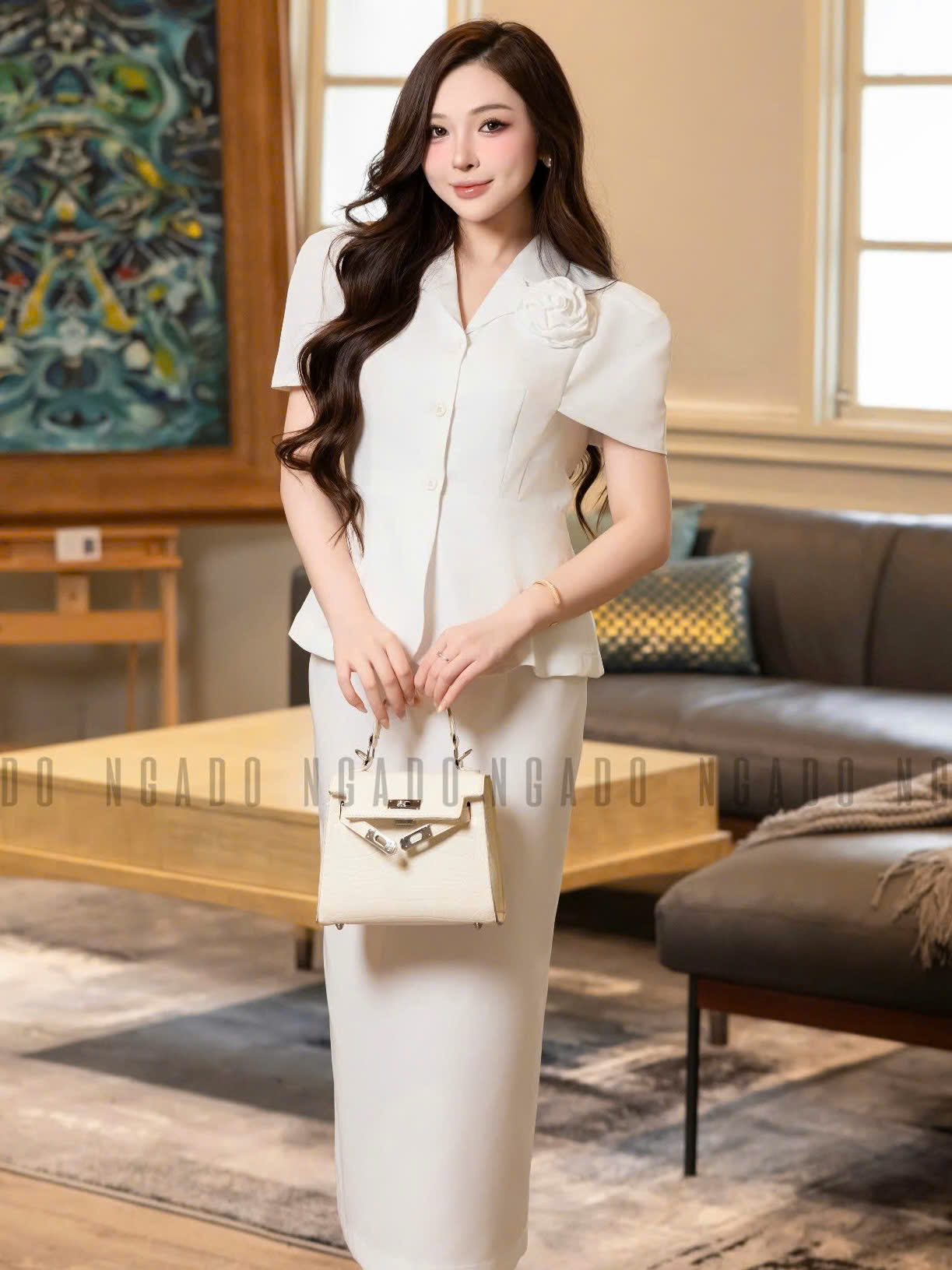 ✨Set áo váy trắng cổ vest NGADO , set áo váy dài , set áo váy công sở , dự tiệc