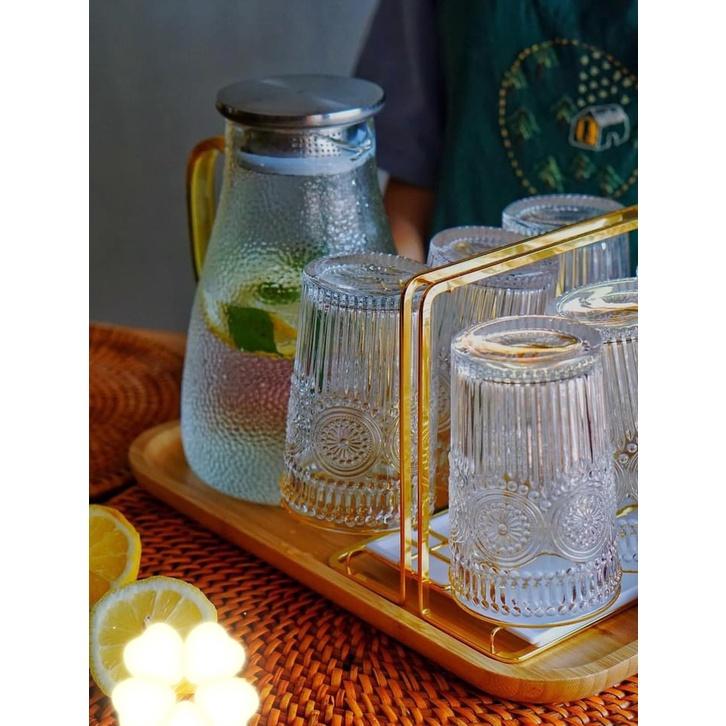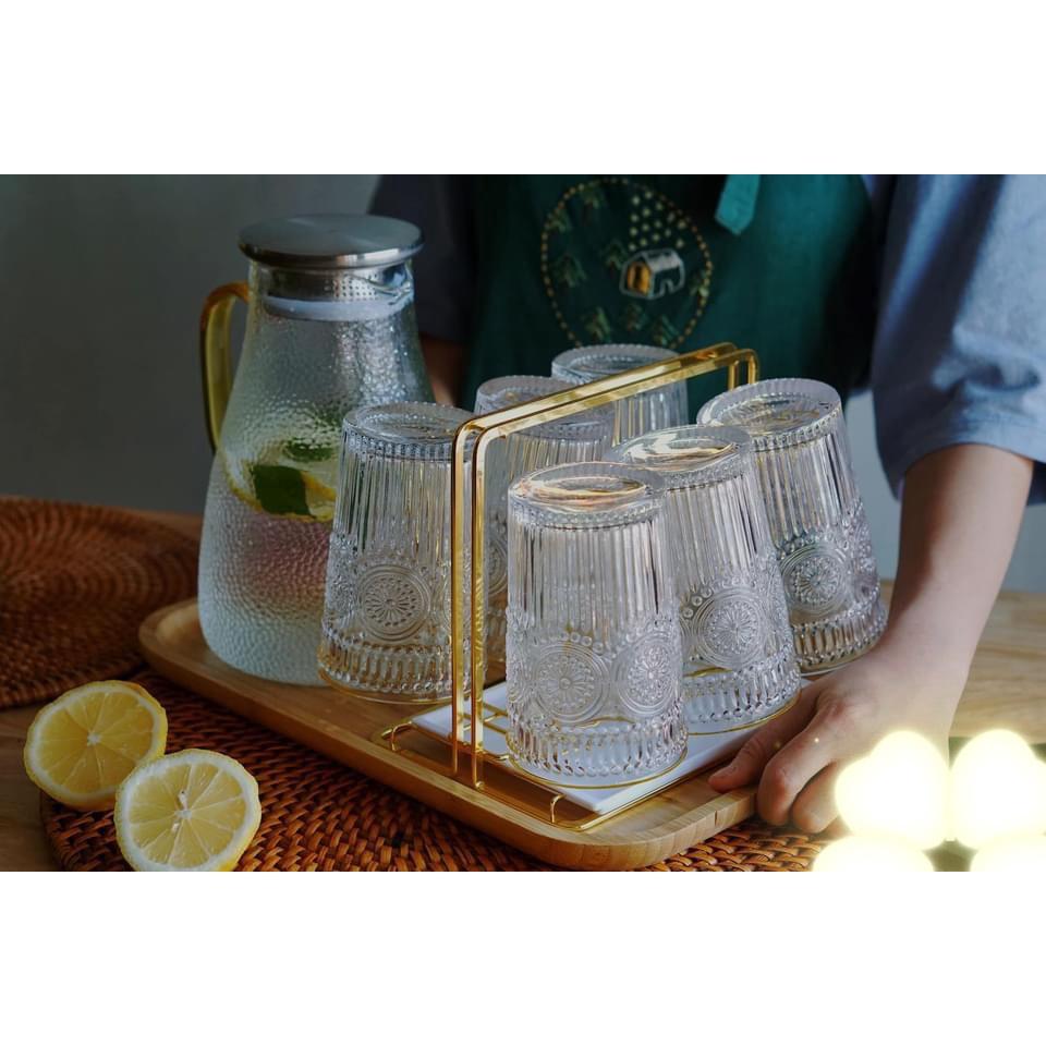 ✨sét bình đựng nước thủy tinh chịu nhiệt vân sần kèm 6 cốc trống đồng cao, khay tre và giá úp cốc