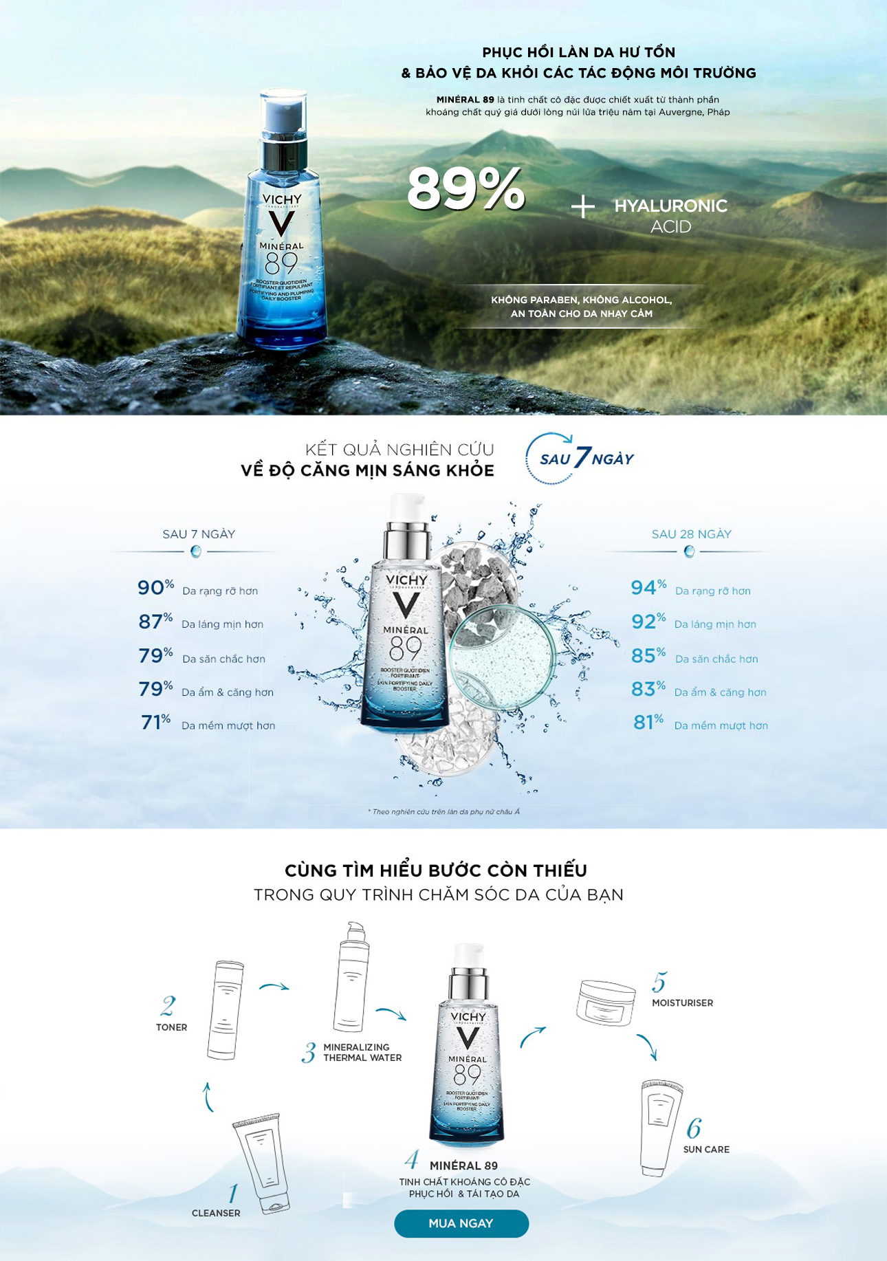 Dưỡng chất khoáng cô đặc Vichy Mineral 89 với thành phần 89% là nước khoáng cô đặc chứa 15 loại khoáng chất quý hiếm cực kỳ tốt cho da, cùng với Hyaluronic Acid tạo nên một lớp hàng rào bảo vệ da đồng thời phục hồi da căng mịn khỏe khoắn.