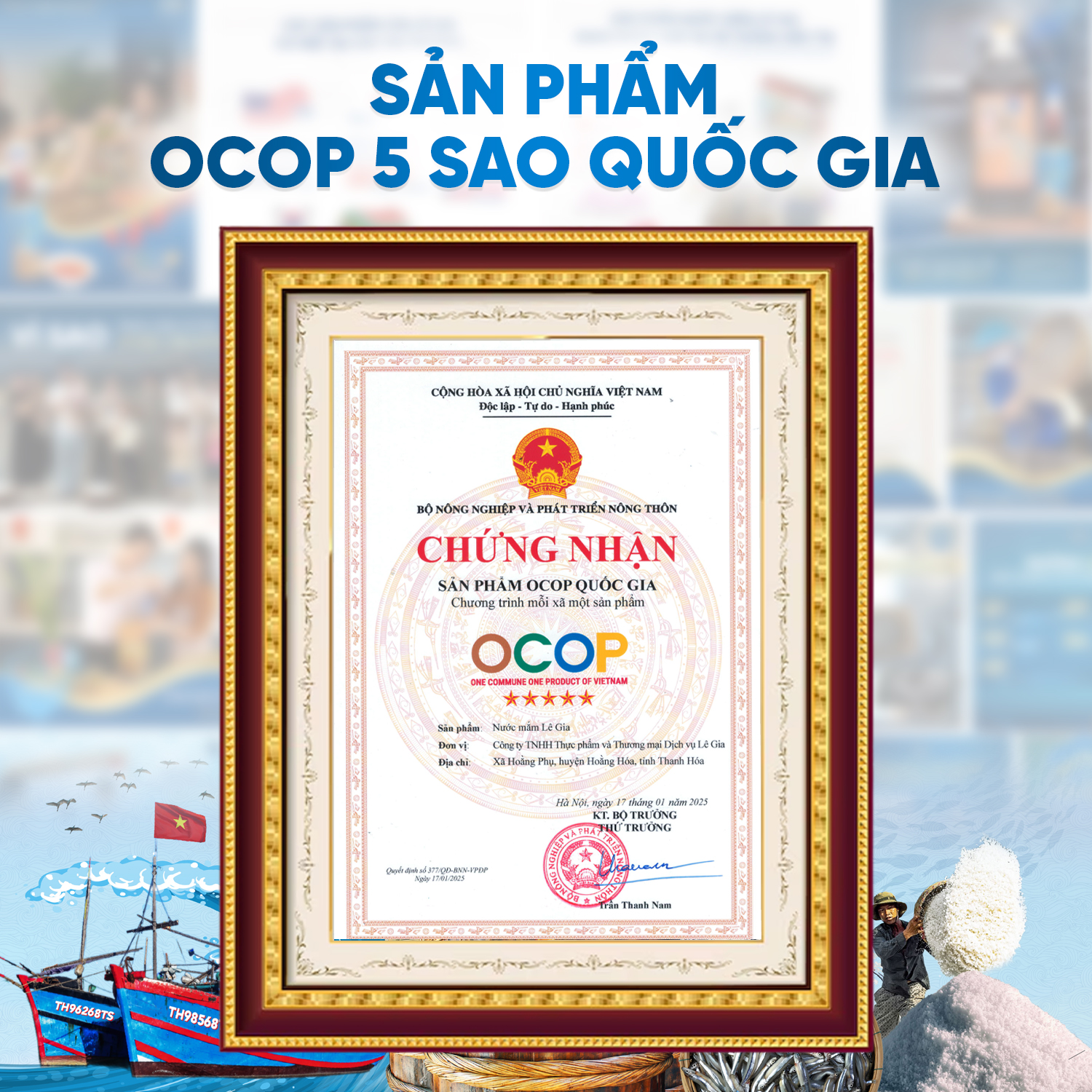 Nước Mắm Cá Đen Phan Thiết đạt chứng nhận tiêu chuẩn HACCP ( tiêu chuẩn VSATTP Châu Âu), OCOP 4 SAO (hạng mục tỉnh Bình Thuận), có giấy phép kiểm định của viện Pasteur HCM