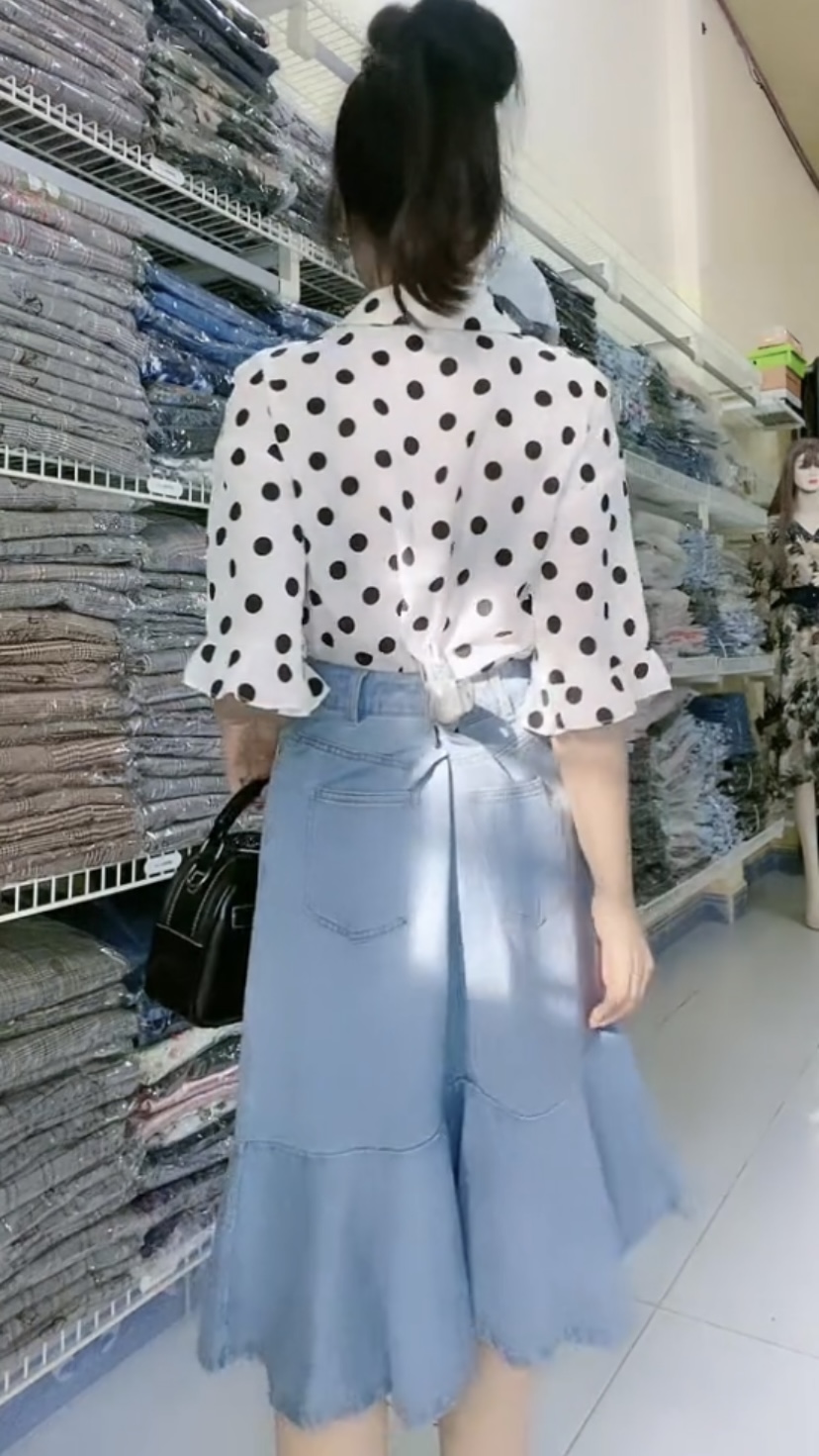 Set sơ mi chấm bi và váy đuôi cá bất đối xứng Mã: SVZBG001 Màu: Xanh + Trắng chấm bi đen Chất liệu: Denim, linen Số đo vòng1 - vòng2(cm): 91 giãn nhẹ - 74