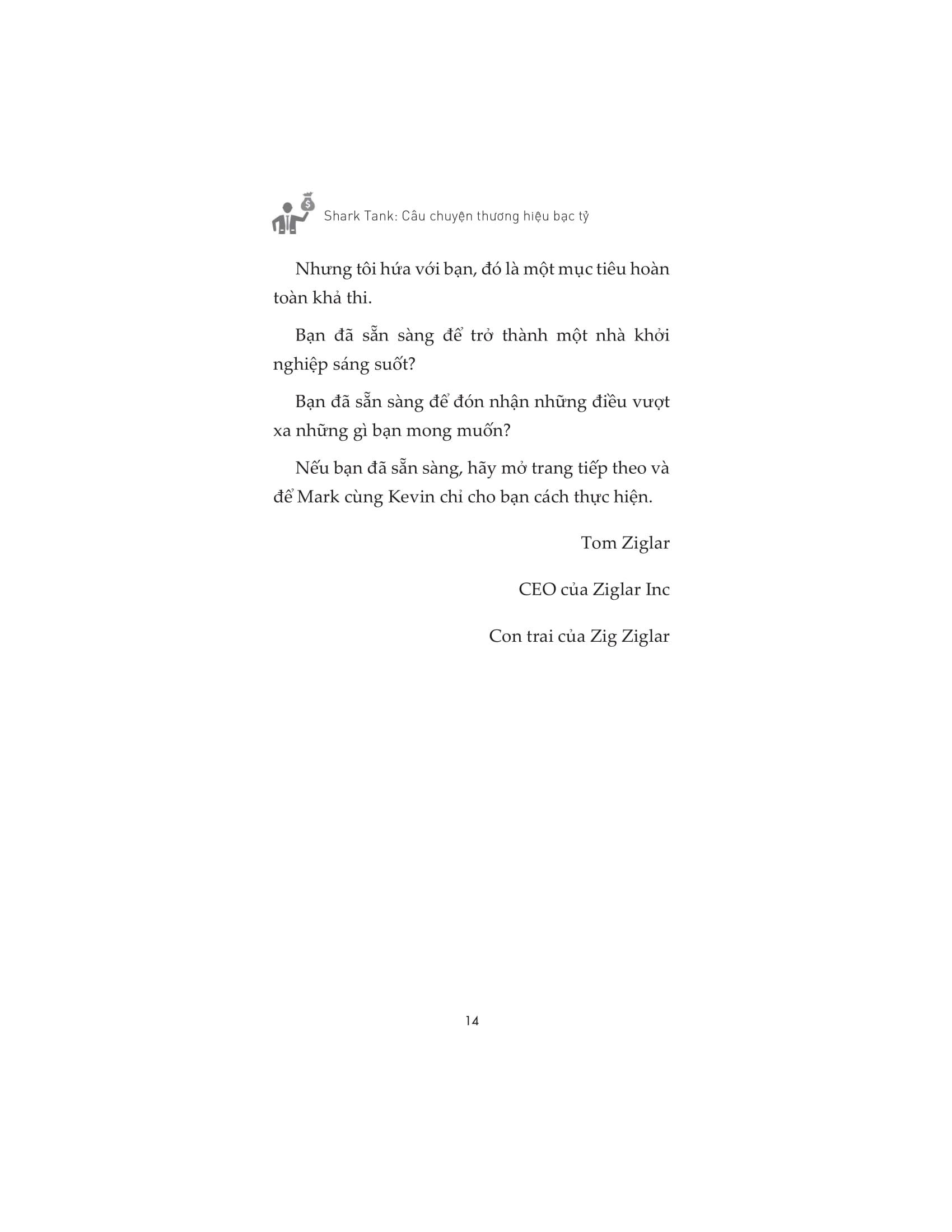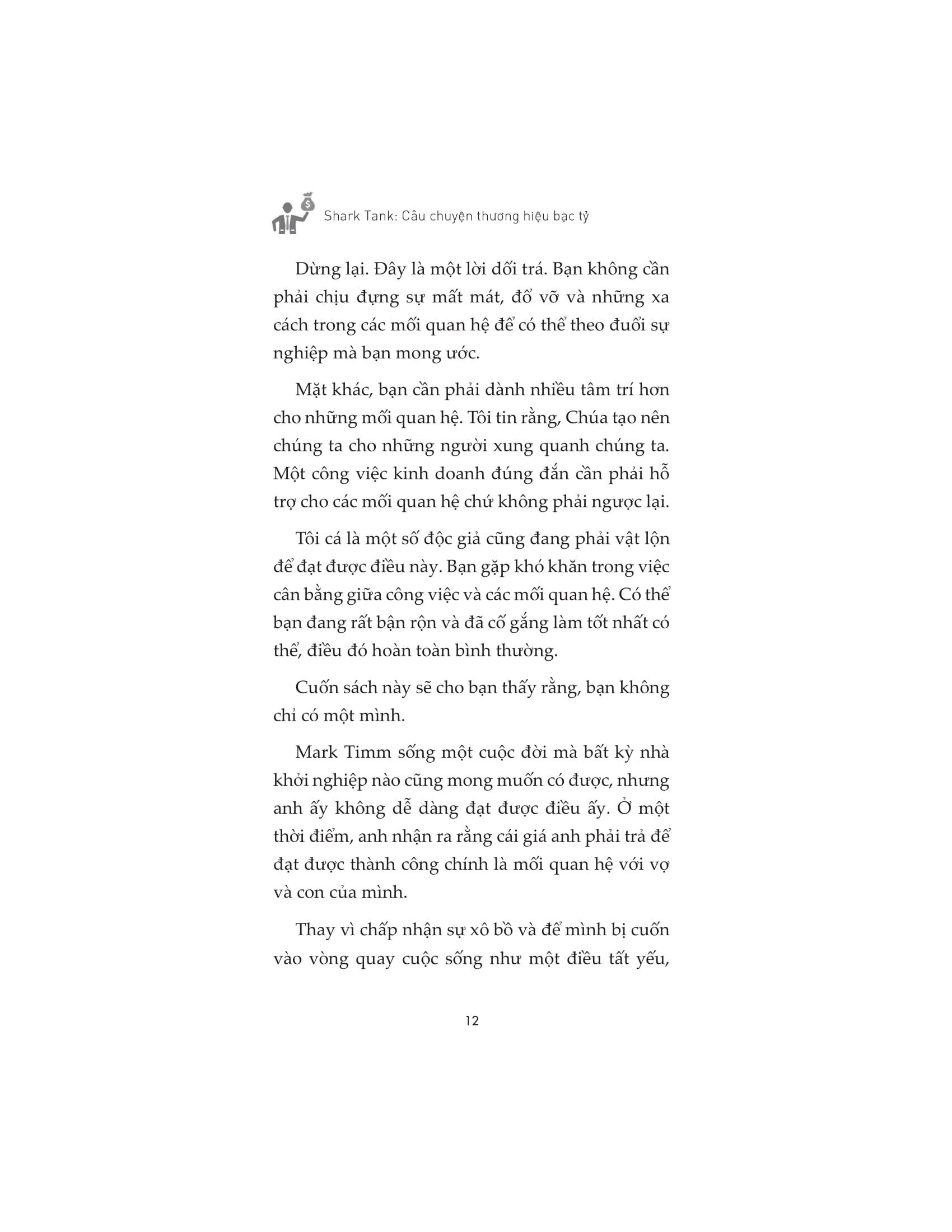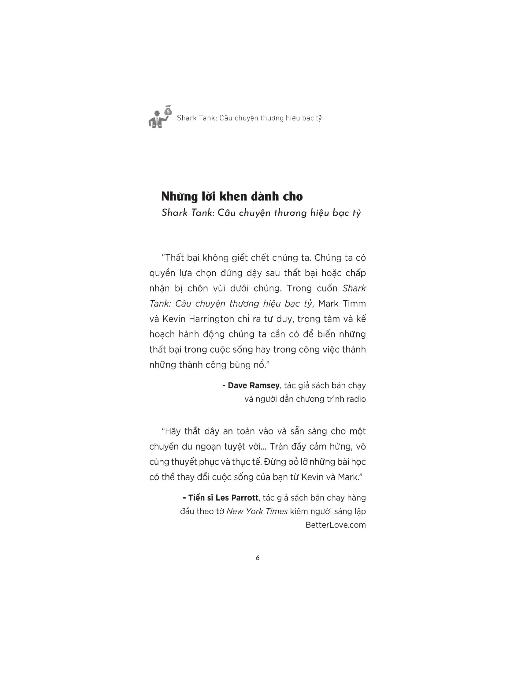 Shark Tank: Câu chuyện thương hiệu bạc tỷ, bộ đôi tác giả Kevin Harrington, một trong những “cá mập” đầu tiên của chương trình ăn khách Shark Tank, và doanh nhân Mark Timm sẽ dẫn dắt độc giả vào một hành trình đầy lôi cuốn, tìm hiểu những ý tưởng kinh doanh và chiến thuật cạnh tranh có khả năng chiếm lĩnh thị trường của những siêu sao khởi nghiệp hàng đầu thế giới.
