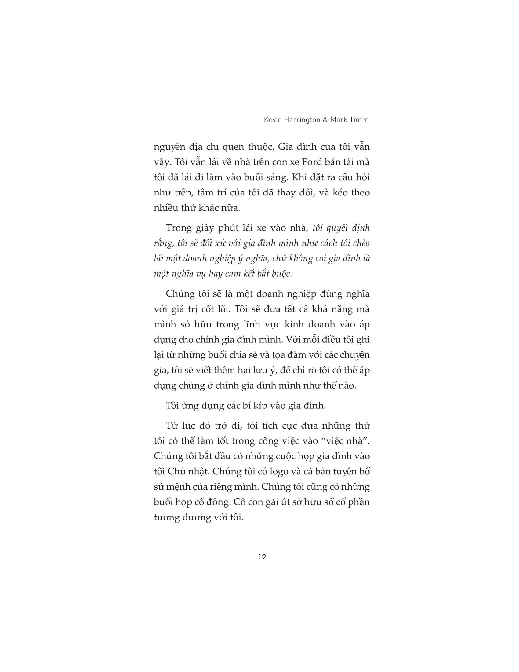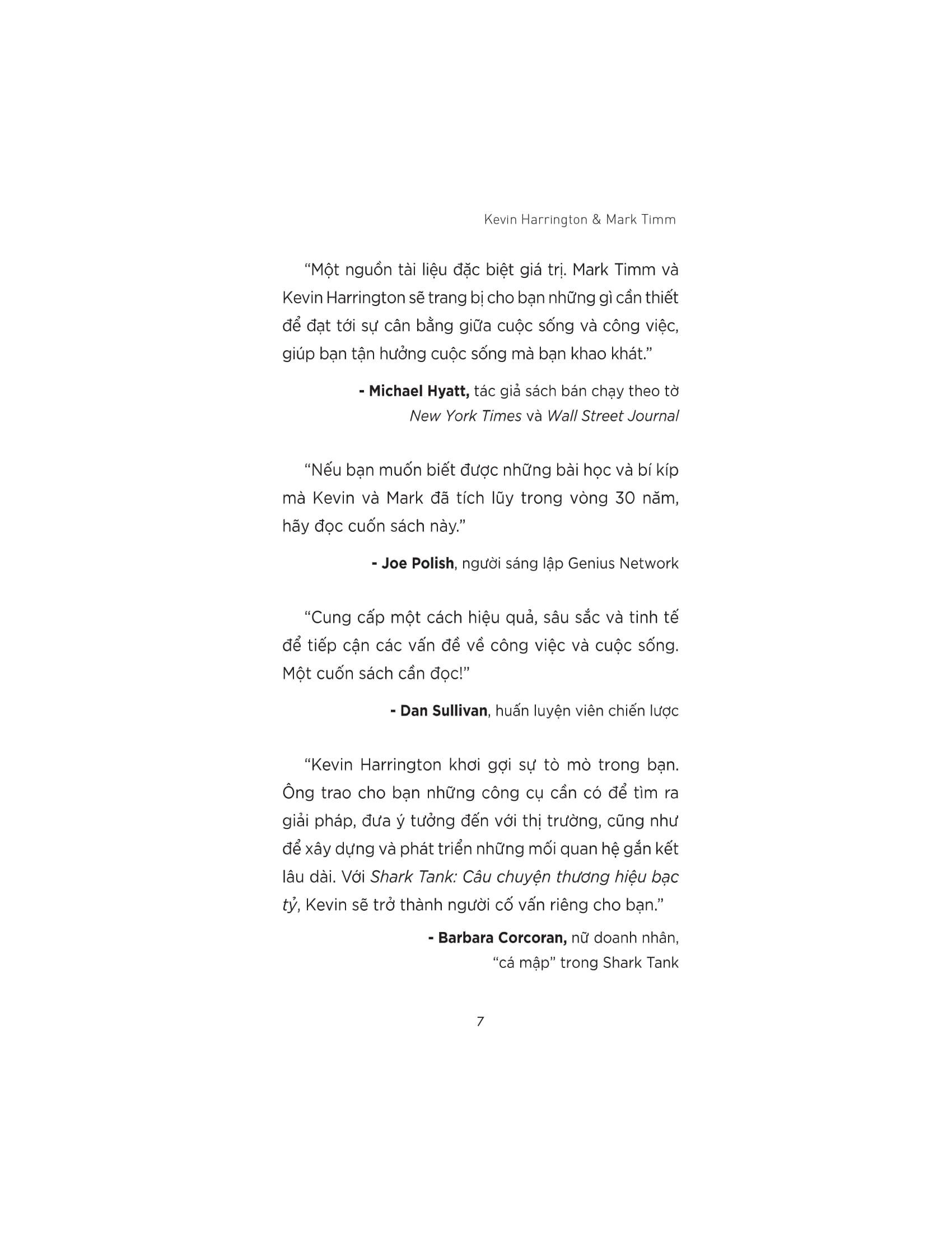 Ngoài ra, Kevin và Mark Timm cũng không ngần ngại chia sẻ những sai lầm mà họ đã mắc phải trong sự nghiệp. Thông qua đó, giúp các nhà khởi nghiệp tránh đi vào “vết xe đổ”, hình thành tư duy đúng đắn và tập trung vào hành động để đạt được những thành công trọn vẹn - tại nơi làm việc, tại gia đình và trong mọi lĩnh vực của cuộc sống.