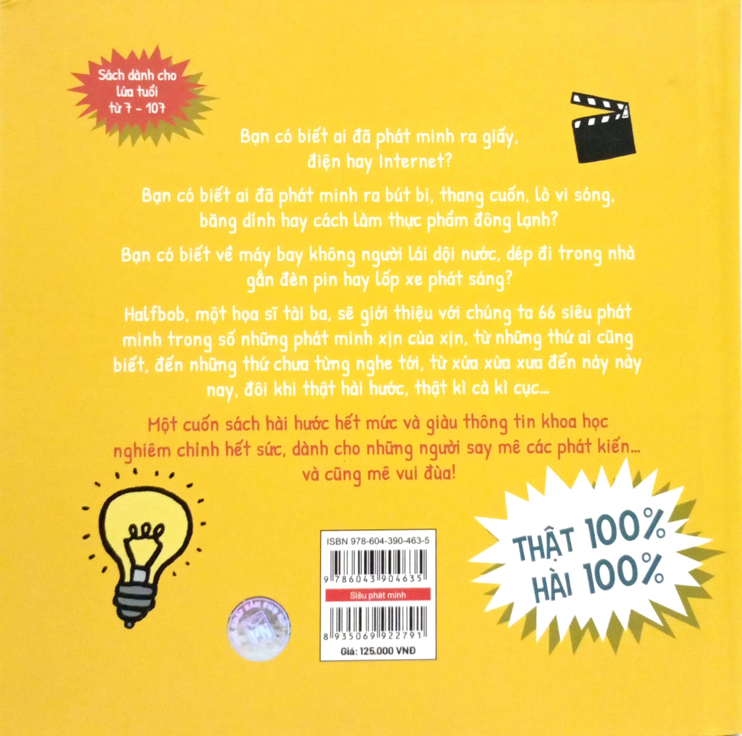 Siêu Phát Minh - Những Bí Mật Bật Ngửa Trong Lĩnh Vực Khoa Học - Bìa Cứng SIÊU PHÁT MINH Bạn có biết ai đã phát minh ra giấy, điện hay Internet? Bạn có biết ai đã phát minh ra bút bi, thang cuốn, lò vi sóng, băng dính hay thực phẩm đông lạnh? Bạn có biết tới máy bay không người lái dội nước, dép đi trong nhà gắn đèn pin hay lốp xe phát sáng? Chú Halfbob, một họa sĩ dí dỏm, sẽ giới thiệu với chúng ta 66 siêu phát minh, từ những thứ ai cũng biết đến những thứ chưa ai từng nghe qua, từ xửa xừa xưa đến nảy này nay, từ hài hước đến kì cà kì cục… Một cuốn sách pha trộn thông tin khoa học nghiêm chỉnh và sự hề hước không hề nhẹ, dành cho những người đam mê phát kiến mà lại ưa vui nhộn! Thật 100% Hài 100% Có thể gọi bộ sách của tác giả hề hước HalfBob là những ấn phẩm toàn “siêu”: Anh muốn làm bạn với trẻ thơ la liệt thông tin lí thú về động vật, về giới tự nhiên cũng như về lĩnh vực khoa học. Nói cách khác, đó là những câu chuyện nho nhỏ – đã trở nên hóm hỉnh nhờ nét vẽ khoáng hoạt, sinh động, lại điểm xuyết câu thoại hoặc lời bình ngộ nghĩnh của chính anh! Thử hỏi bạn nhỏ nào mà chẳng há hốc mồm nghe kể: