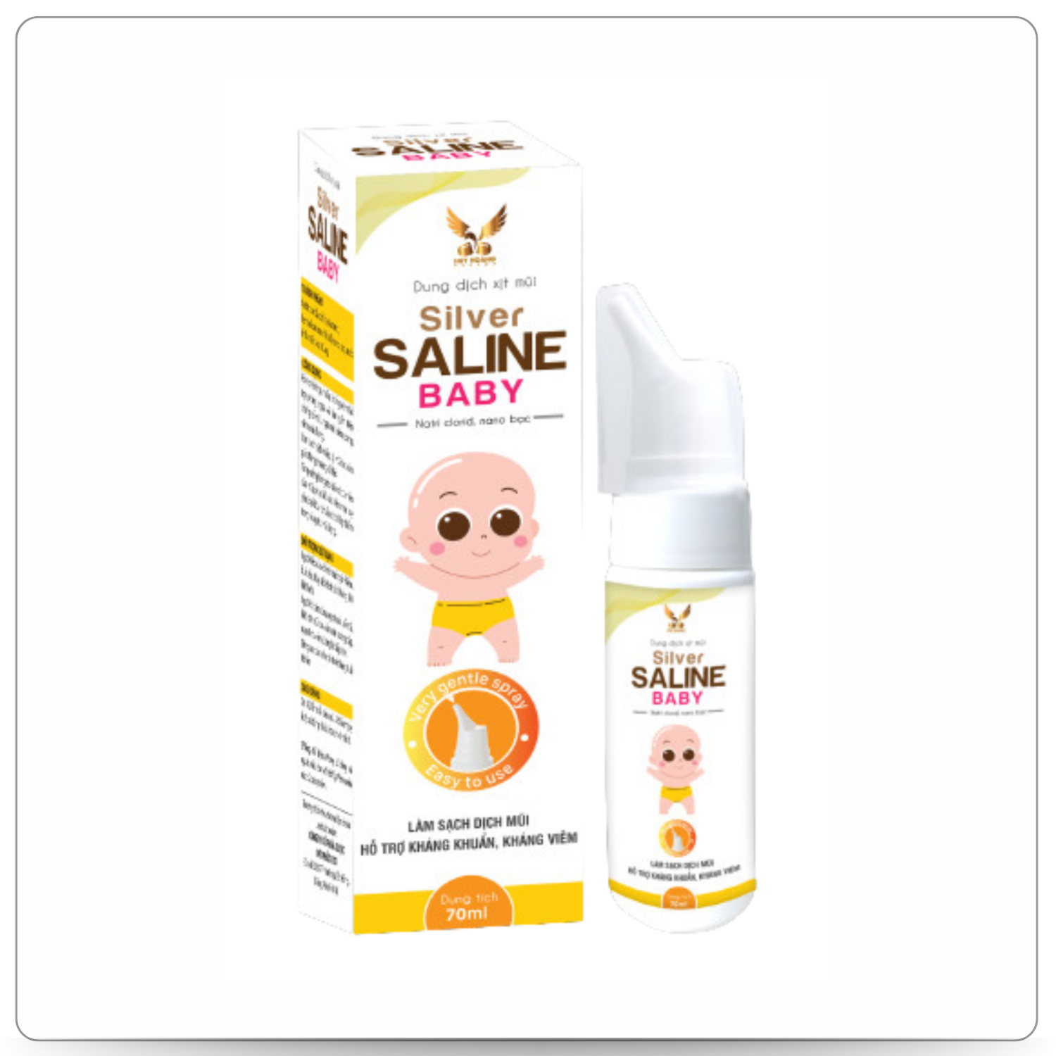 Silver Saline Baby chứa natri clorid, acid hyaluronic, nano bạc,… hỗ trợ phòng ngừa và làm giảm triệu chứng sổ mũi, ngạt mũi viêm xoang và viêm mũi dị ứng, làm sạch dịch nhầy, tạo cảm giác thông thoáng.