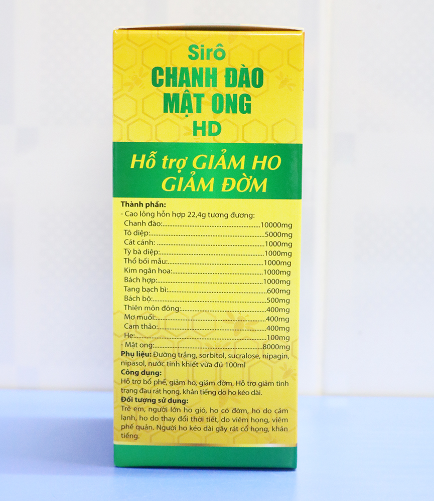 - Mật ong: 8000 mg Phụ liệu: đường trắng, sorbitol, sucralose, nipagin, nipasol, nước tinh khiết vừa đủ 100ml ĐỐI TƯỢNG NÊN SỬ DỤNG SIRO HO CHANH ĐÀO MẬT ONG