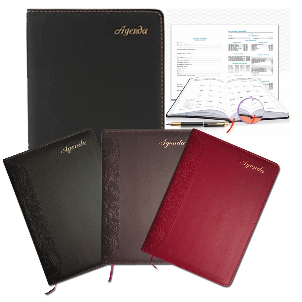 Sổ agenda 2023 bìa simili cao cấp Giáy ford 100g/m2 khổ 14.5*20.5 có ba màu: đỏ, xanh đen, và đen