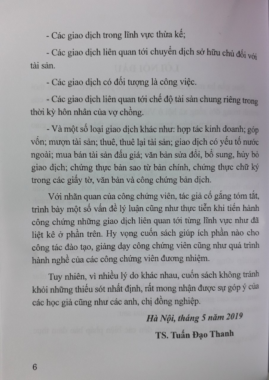 Mua tại TiktokCuốn sách chuyên khảo trình bày một số vấn đề lý luận cũng như thực tiễn khi tiến hành công chứng những giao dịch liên quan tới từng lĩnh vực như các biện pháp bảo đảm thực hiện nghĩa vụ, lĩnh vực thừa kế, chuyển dịch sở hữu chủ đối với tài sản, giao dịch có đối tượng là công việc, giao dịch liên quan tới chế độ tài sản chung riêng trong thời kỳ hôn nhân của vợ chồng…