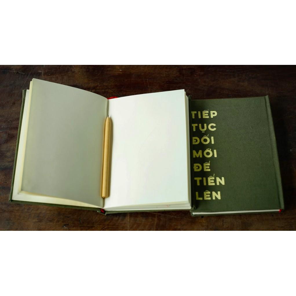 Bìa chắc chắn với câu slogan "Tiếp Tục Đổi Mới Tiến Lên" được in chìm.