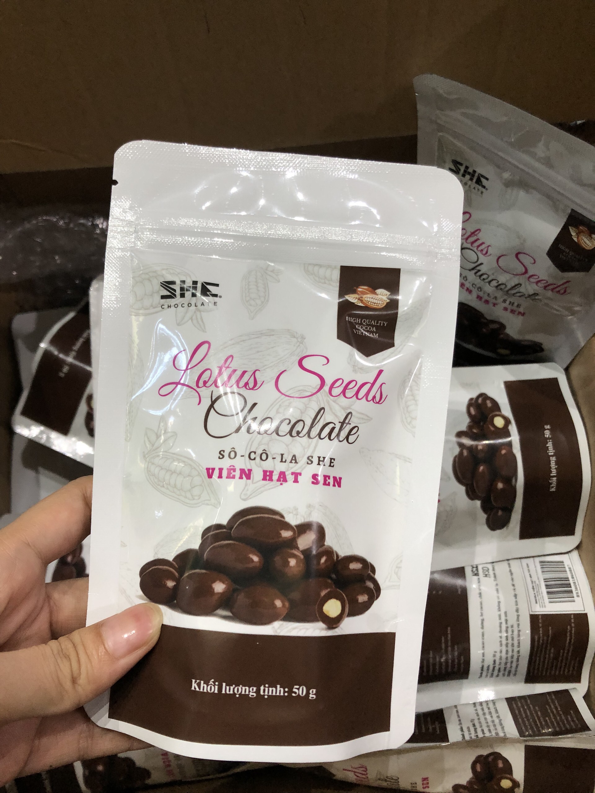 Mua tại TiktokSocola hạt sen sấy giòn SHE Chocolate Socola SHE được làm từ những quả cacao không phân bón và không thuốc bảo vệ thực vật, được chọn lọc rất kỹ từ những nông trại hàng đầu từ các vùng đất của Tây Nguyên, Đông Nam Bộ, đồng bằng sông Cửu Long. Đây chính là những vườn cây cacao ngon nhất thế giới ở Việt Nam. Sự kết hợp đặc biệt giữa hạt sen sấy giòn và socola tạo nên hương vị ấn tượng, khác biệt, độc đáo chỉ có độc nhất tại SHE Socola ngọt ngào tan chảy trên vòm miệng, nó mềm và giòn tan của hạt sen Thông tin sản phẩm