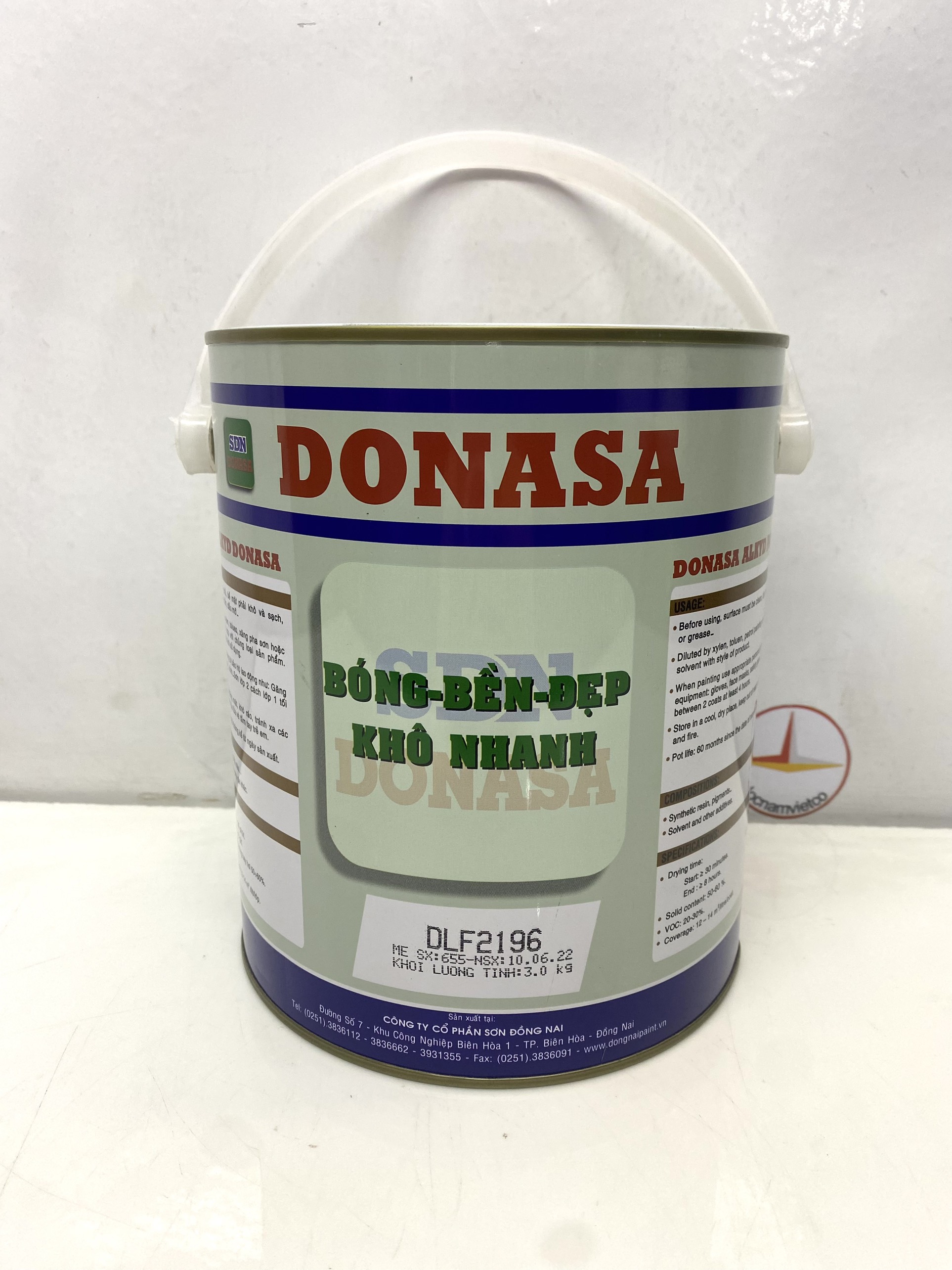 Sơn dầu Đồng Nai Donasa màu cam 2196 3kg  - Sơn Donasa Alkyd là loại Sơn phủ ngoài, trang trí cho các bề mặt gỗ và kim loại.   - Phù hợp các công trình xây dựng dân dựng,dùng sơn nội và ngoại thất.  Đặc điểm:  Sơn Đồng Nai  Alkyd Bám dính tốt trên bề mặt gỗ và kim loại. -   Bền màu, chịu phấn hóa. -   Bề mặt mịn, láng và giữ bóng. -   Không chứa chì,chrome và dẫn xuất của chúng. -   Dễ sử dụng khi thi công. Mã sản phẩm: DLF 1xxx: Đen - DLF 2xxx: Đỏ - DLF 3xxx: Ghi - DLF 4xxx: Tím DLF 5xxx: Trắng pha - DLF 6xxx: Vàng tone nghệ - DLF 7xxx: Vàng tone đất - DLF 8xxx: Xanh tone Blue - DLF 9xxx: Xanh tone Green Mã màu sơn dầu: vàng kem 7079 peaceful white;  6068 creamy; 7053 lily; 7052 tiffany powder; vàng 6000 reddish yellow; 9254 varut; 7055 muffin; 6053 coffee crunch; 6055 pumpkin; 6301 golden honey; xám 3106 pastel grey; 3040 light grey; 3039 moonless; 3062 light grey; 3000 weatherbell; 3041 silent blue; 8051 pacific blue; 8503 blue phlox; 9062 savin hill; 9000 green; 8052 peace blue; 8054 periwinkle; 8055 legend blue; 8053 porcelain blue; xanh dương 8000 marine blue; 9051 clear pond; 9013 lime freeze;9058 set sail; 9052 jade; 9055 spruce; 9255 antique; 2059 brown; 2057 russet; 2021 red fly; 2054 ruby red; 3076 silver; đen mờ 1027 matt black; màu trắng mờ  matt white 5035; màu xanh 8519 matt blue; 6170 lemon yellow,