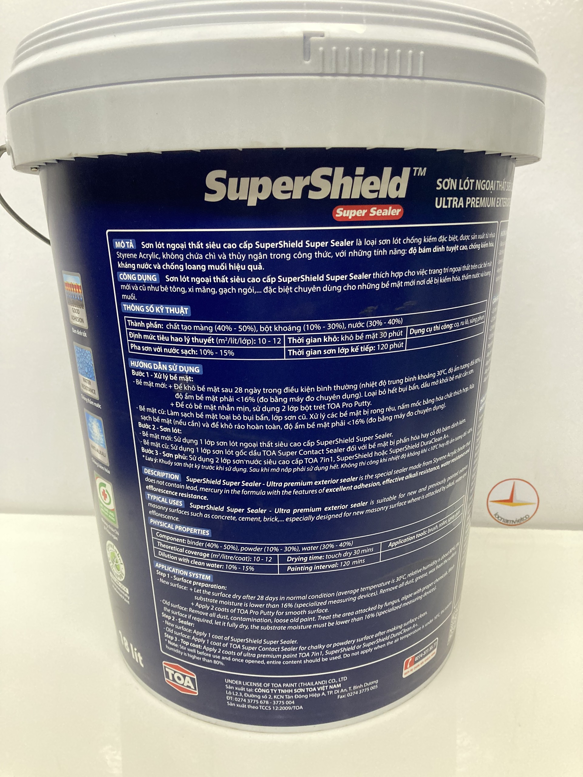 Mua tại TiktokSơn lót chống kiềm ngoại thất siêu cao cấp TOA Supershield Sealer _18L Sơn lót ngoại thất siêu cao cấp Toa SuperShield Super Sealer là loại sơn lót chống kiềm đặc biệt, được sản xuất từ nhựa Styrene Acrylic, không sử dụng chì trong công thức. Sản phẩm có những tính năng nổi trội: chống kiềm hóa, độ bám dính tuyệt vời, kháng nước và chống loang muối hiệu quả.