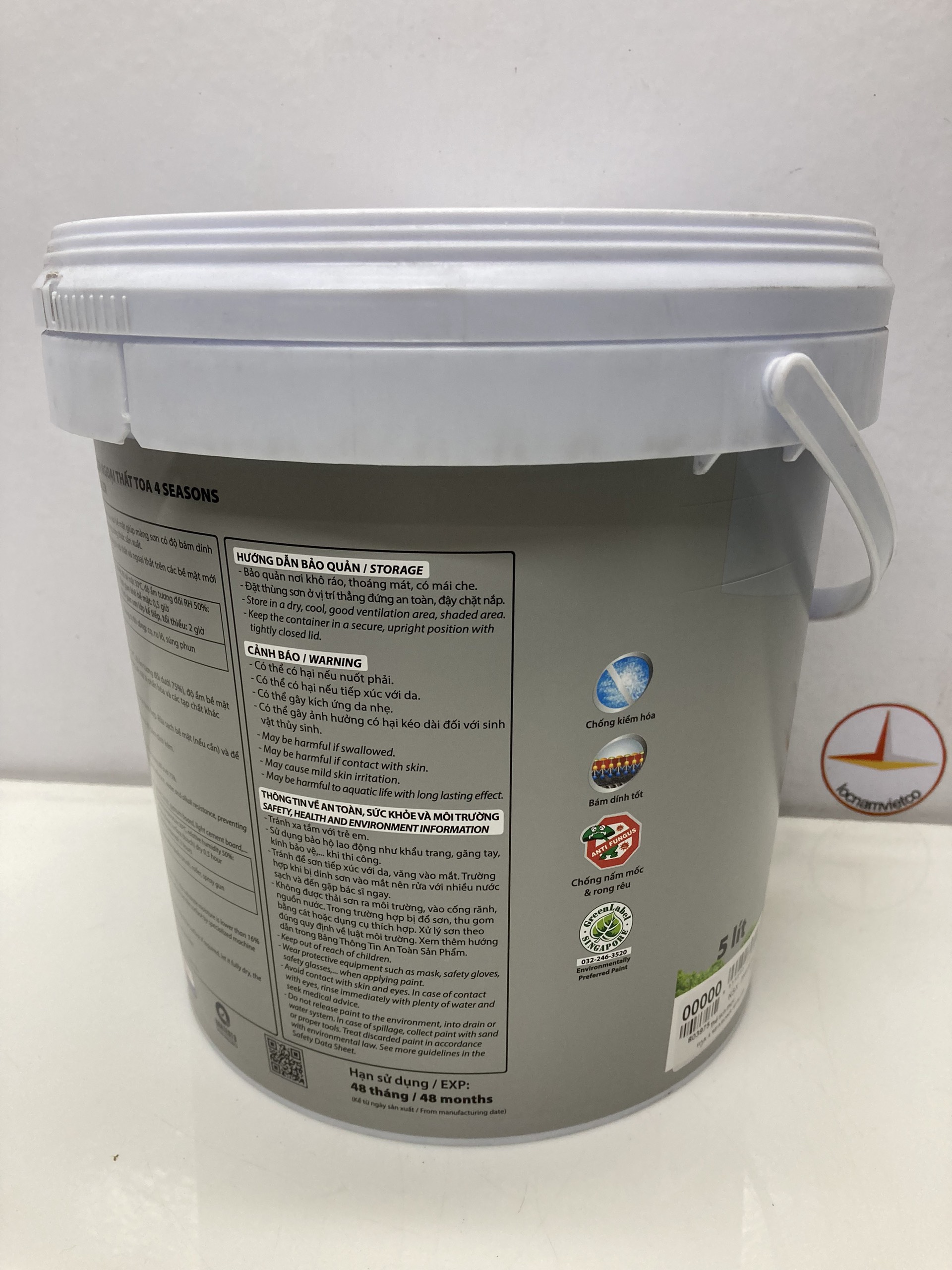 Mua tại TiktokSơn lót chống kiềm ngoại thất Toa 4 Seasons 5L Sơn lót chống kiềm Ngoại thất TOA 4 Seasons Sealer là loại sơn lót được sản xuất từ nhựa Styrene Acrylic, thấm sâu vào bề mặt mang lại màng sơn độ bám dính cao, kháng kiềm, kháng nước và chống loang muối hiệu quả. Sản phẩm không chứa Chì, Phoóc-môn.