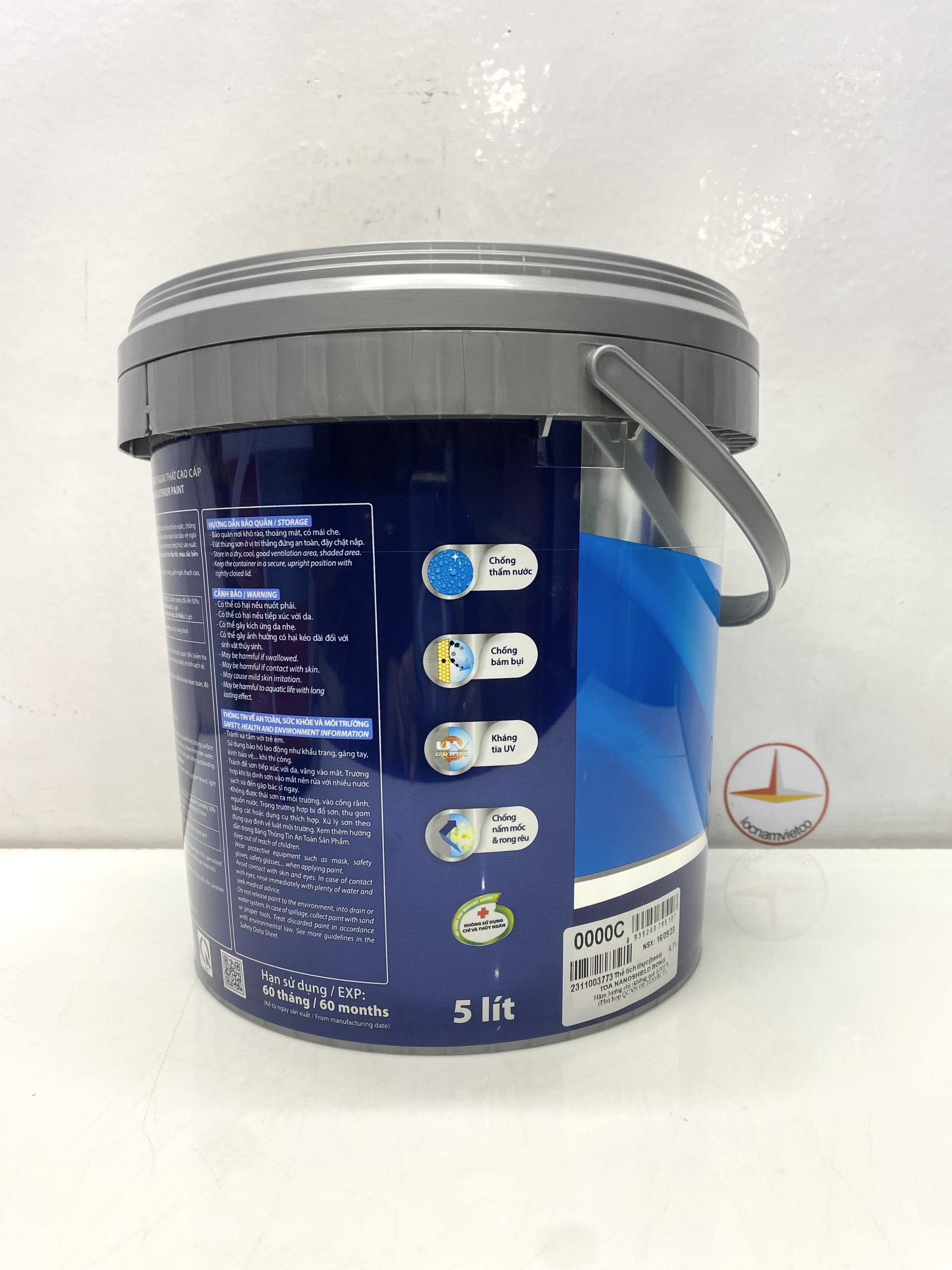 Chống bám bụi  MỤC ĐÍCH SỬ DỤNG: Sơn Nước ToaNanoShield thích hợp cho việc trang trí ngoại thất trên các bề mặt mới và cũ như bê tông, tường xi măng, gạch ngói…; đặc biệt dùng cho những nơi cần được bảo vệ khỏi thời tiết khắc nghiệt và môi trường bụi bẩn.  ĐẶC TÍNH SẢN PHẨM: · Thành phần cấu tạo: Chất tạo màng, Bột khoáng, Nước. · Màu sắc: Nhiều màu Theo bảng màu và quạt màu TOA · Bề mặt hoàn thiện: Bóng, Bóng mờ · Thể tích chất rắn: 41.5 ± 2 (% theo thể tích) · Độ phủ lý thuyết: 10.4 – 13.8 m2/lít/lớp Độ phủ thực tế sẽ phụ thuộc vào khả năng dàn trải của màng sơn, độ dày màng sơn khô, bề mặt thi công, tay nghề thợ sơn và lượng sơn hao hụt thực tế khi thi công. ·Hàm lượng chất hữu cơ bay hơi (VOCs): ≤ 50 g/L bề mặt bóng mờ và ≤ 65 g/L bề mặt bóng  Thời gian khô ở nhiệt độ 30 oC: khô bề mặt 30 phút ; khô cứng:4h  Đóng gói: 15 lít; 5 lít; 0.875 lít Dụng cụ: Cọ, ru-lô/con lăn, súng phun sơn thông thường Tỷ lệ pha loãng:Sơn sẵn sàng sử dụng sau khi được khuấy trộn đồng nhất. Nếu có nhu cầu pha loãng, chỉ nên pha tối đa 5% với nước ngọt sạch. HƯỚNG DẪN THI CÔNG: Bước 1:  Xử lý bề mặt: Bề mặt mới: