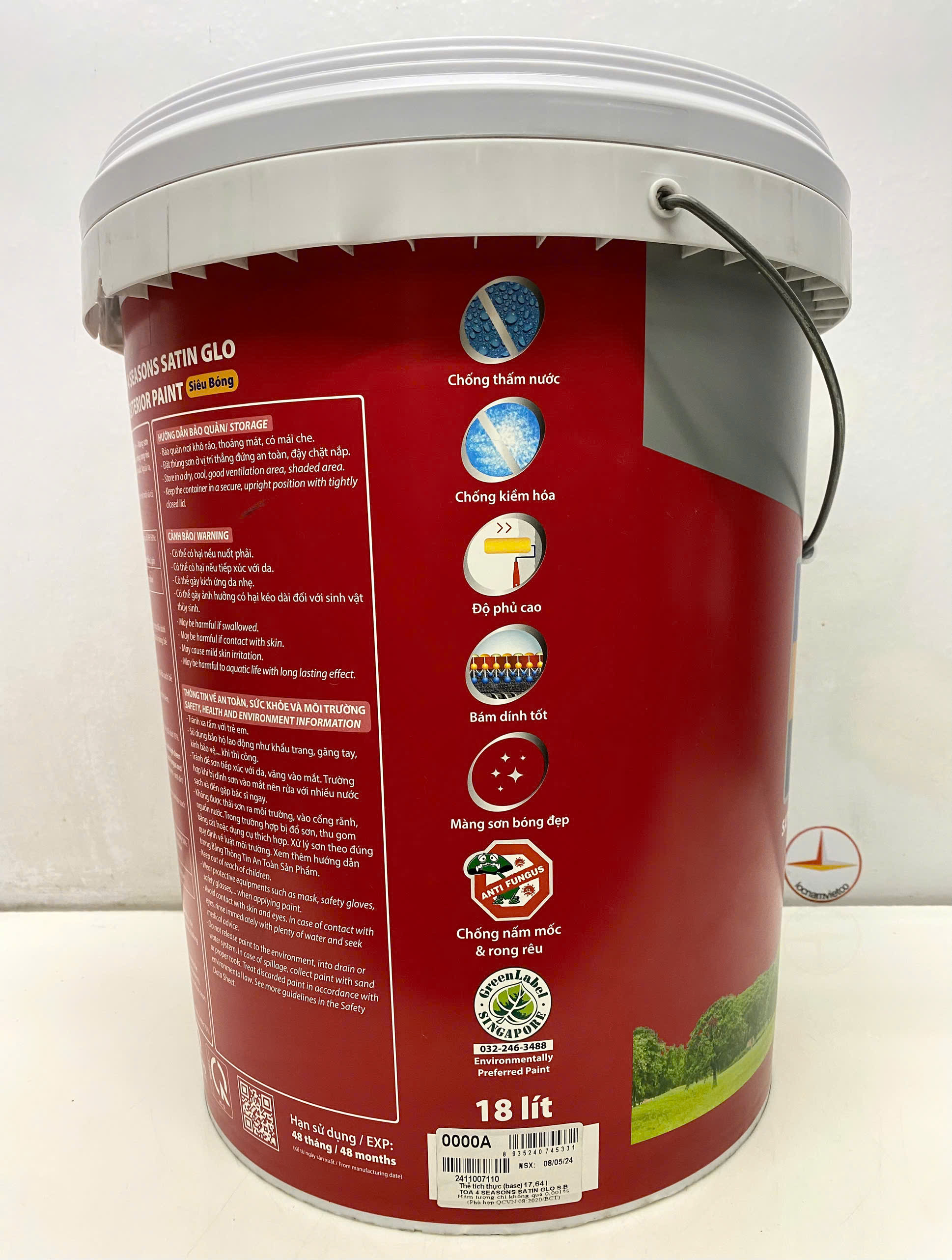 Mua tại TiktokSơn nước ngoại thất cao cấp TOA 4 Seasons Satin Glo siêu bóng màu xám 8257 _ 18L Sơn nước ngoại thất cao cấp TOA 4 Seasons Satin Glo siêu bóng là sơn nước dành cho ngoài trời, được sản xuất từ nhựa nhũ tương Acrylic với các ưu điểm màng sơn bóng với độ phủ cao, khả năng chống chịu tốt với điều kiện thời tiết khắc nghiệt: bền màu, chống phấn hóa, chống rong rêu nấm mốc, chống phai màu. Ưu điểm: