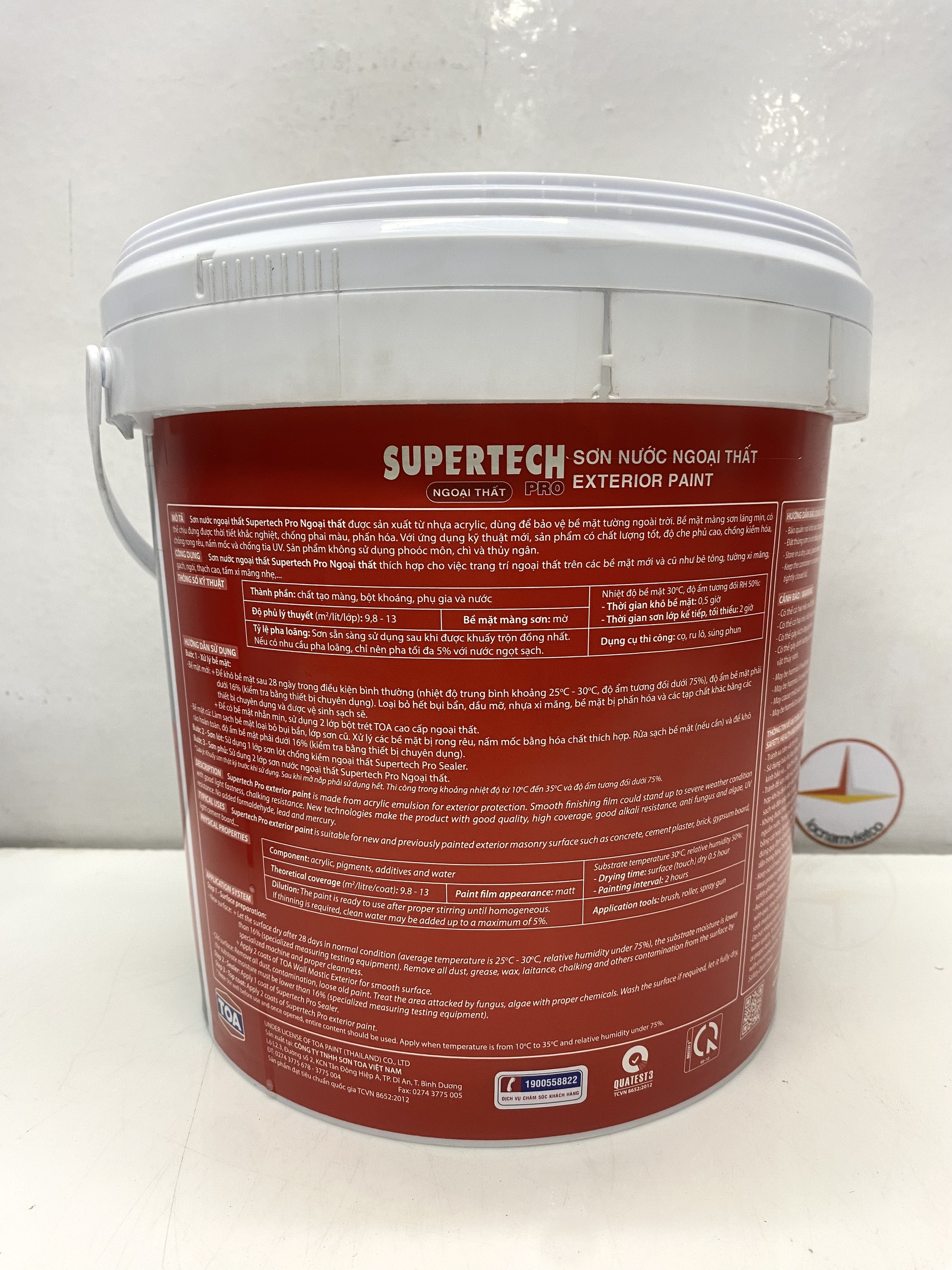 Không chứa Phoóc-môn, Chì.  MỤC ĐÍCH SỬ DỤNG: Sơn Nước ToaSupertech Pro Ngoại thất thích hợp sử dụng trên các bề mặt tường, bê tông, thạch cao, gạch..  ĐẶC TÍNH SẢN PHẨM: · Thành phần cấu tạo: Chất tạo màng, bột khoáng, phụ gia & nước. · Màu sắc: Nhiều màu Theo bảng màu và quạt màu TOA · Bề mặt hoàn thiện: Mờ · Thể tích chất rắn: 39 ± 2 (% theo thể tích) · Độ phủ lý thuyết: 9.8 – 13 m2/lít/lớp Độ phủ thực tế sẽ phụ thuộc vào khả năng dàn trải của màng sơn, độ dày màng sơn khô, bề mặt thi công, tay nghề thợ sơn và lượng sơn hao hụt thực tế khi thi công. ·Hàm lượng chất hữu cơ bay hơi (VOCs): ≤ 50 g/L  Thời gian khô ở nhiệt độ 30 oC: khô bề mặt 30 phút ; khô cứng:4h  Đóng gói: 18 lít; 5 lít Dụng cụ: Cọ, ru-lô/con lăn, súng phun sơn thông thường Tỷ lệ pha loãng:Sơn sẵn sàng sử dụng sau khi được khuấy trộn đồng nhất. Nếu có nhu cầu pha loãng, chỉ nên pha tối đa 5% với nước ngọt sạch. HƯỚNG DẪN THI CÔNG:   Bước 1: - Xử lý bề mặt: Bề mặt mới:
