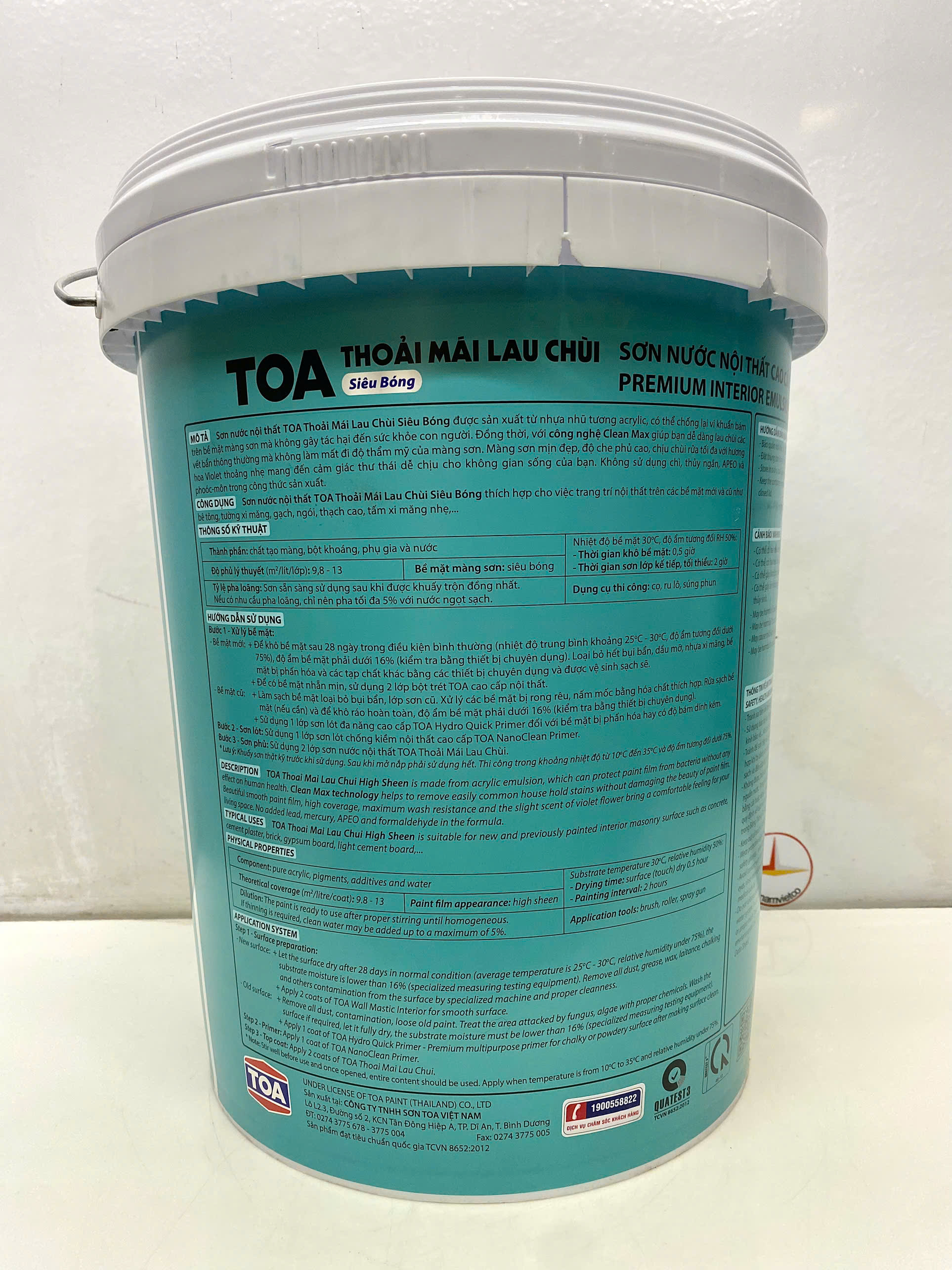 Độ phủ cao, màng sơn bóng mịn đẹp  MỤC ĐÍCH SỬ DỤNG: Sơn Nước Toathoải mái lau chùi siêu bóng  thích hợp cho việc trang trí nội thất trên các bề mặt mới và cũ như bê tông, tường xi măng, bê tông, thạch cao, gạch, ngói, tấm xi măng nhẹ, v.v...  ĐẶC TÍNH SẢN PHẨM:  - Thành phần cấu tạo: Chất tạo màng, Bột khoáng, Nước.  - Màu sắc: Nhiều màu Theo bảng màu và quạt  màu TOA  - Bề mặt hoàn thiện: Bóng  - Thể tích chất rắn: 39 ± 2 (% theo thể tích)  - Độ phủ lý thuyết: 10 – 13 m2/lít/lớp Độ phủ thực tế sẽ phụ thuộc vào khả năng dàn trải của màng sơn, độ dày màng sơn khô, bề mặt thi công, tay nghề thợ sơn và lượng sơn hao hụt thực tế khi thi công.  - Hàm lượng chất hữu cơ bay hơi (VOCs): ≤ 30 g/L  - Thời gian khô ở nhiệt độ 30 oC: khô bề mặt: 30 phút ; khô cứng:4h  - Đóng gói: 18L; 5L; 1L  - Dụng cụ: Cọ, ru-lô/con lăn,  súng phun sơn thông thường  - Tỉ lệ pha loãng: Sơn sẵn sàng sử dụng sau khi được khuấy trộn đồng nhất. Nếu có nhu cầu pha loãng, chỉ nên pha tối đa 5% với nước ngọt sạch. HƯỚNG DẪN THI CÔNG: Bước 1:  Xử lý bề mặt: Bề mặt mới:
